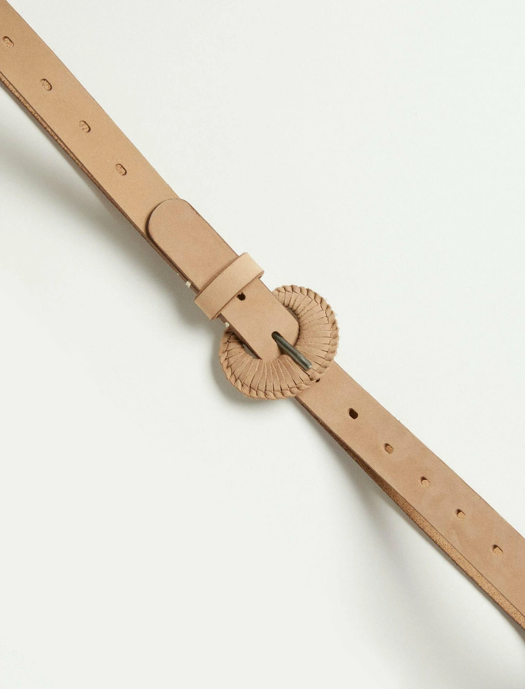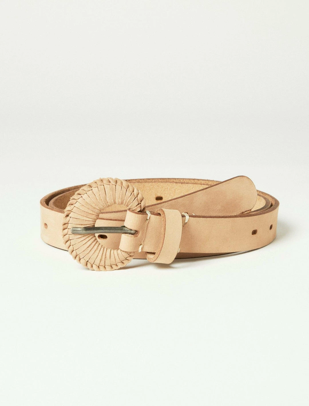 Add a boho touch to any look with this cream-colored leather belt featuring a braided-style buckle for added flair.ul. ul