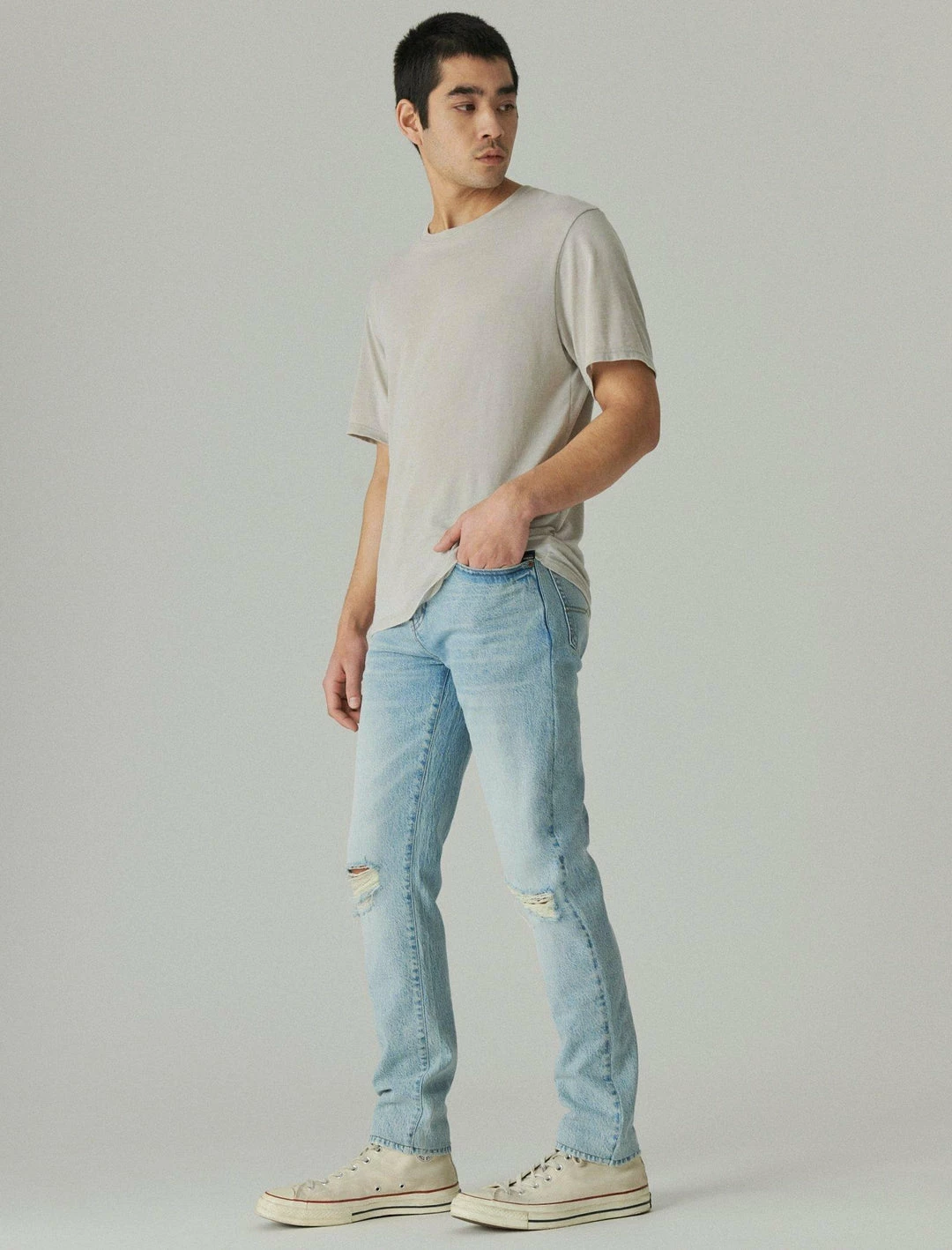 The 110 Slim is our modern slim fit jean that sits low at the hips and is cut close to the body for a lean look.Low rise with a slim fit and narrow leg. Distressed vintage light wash denim. Comfort stretch with just the right amount of give. 5-pocket styling with button-and-zip fly