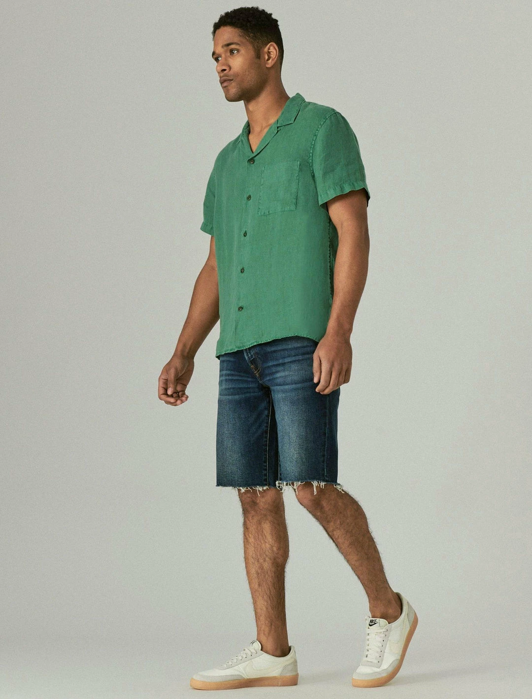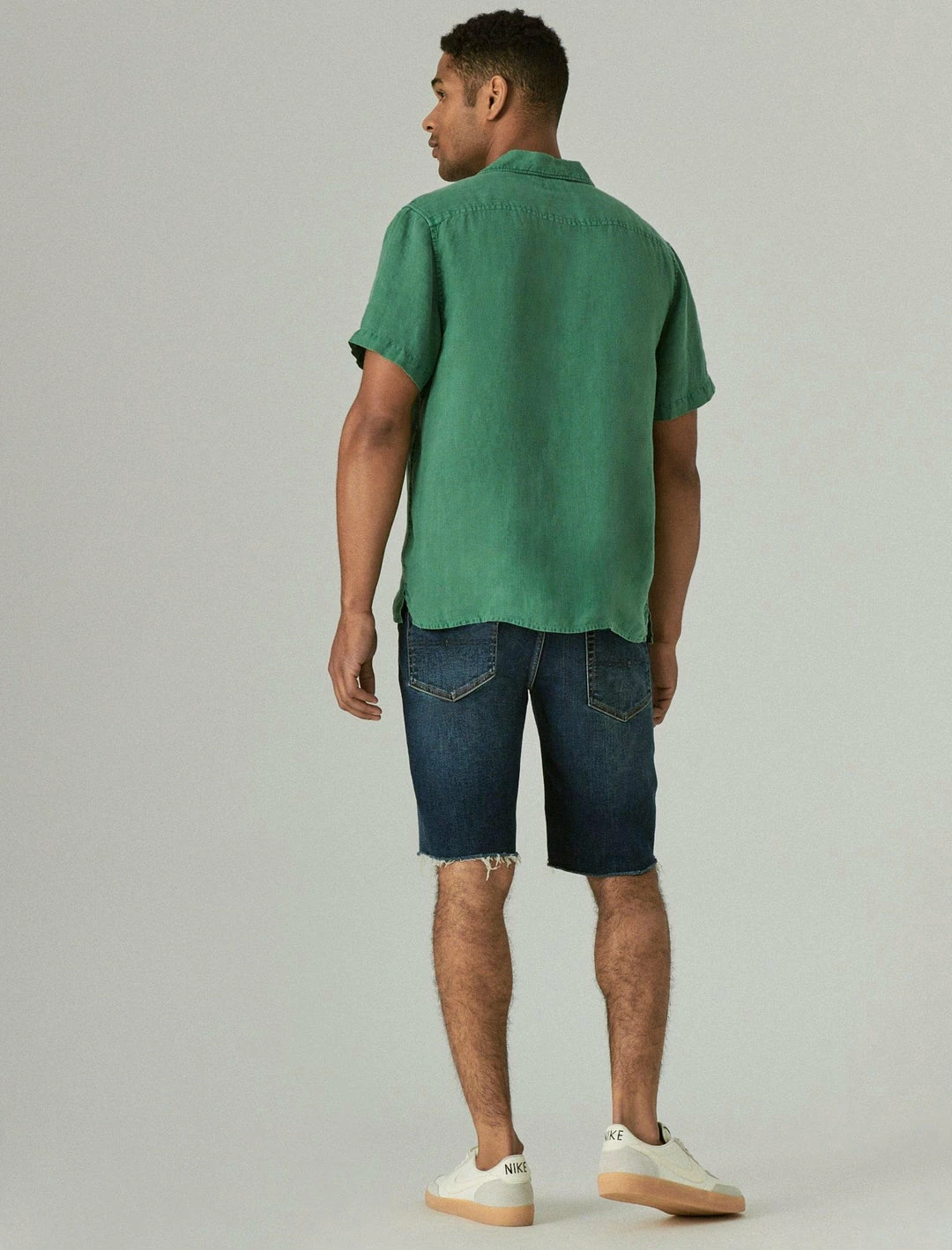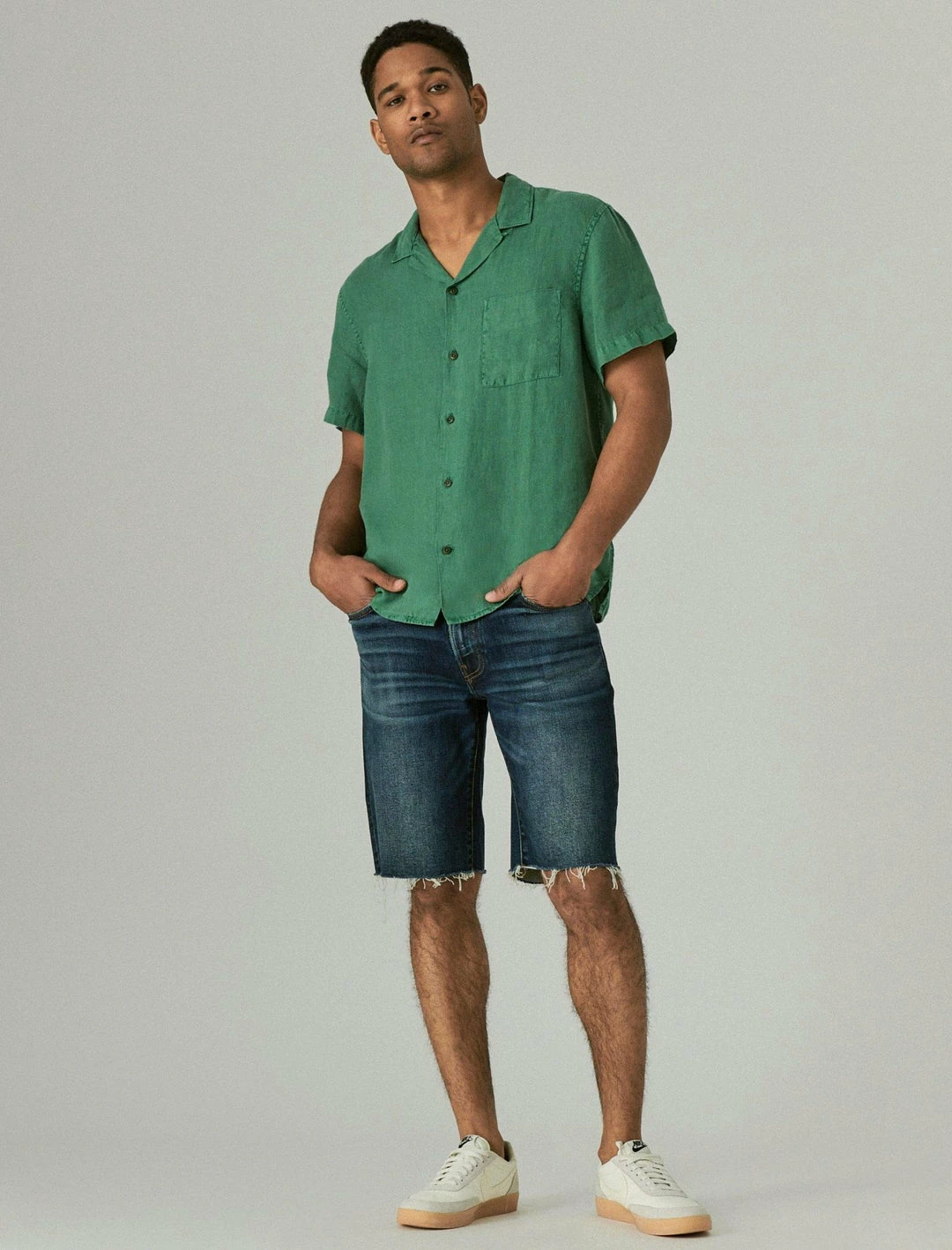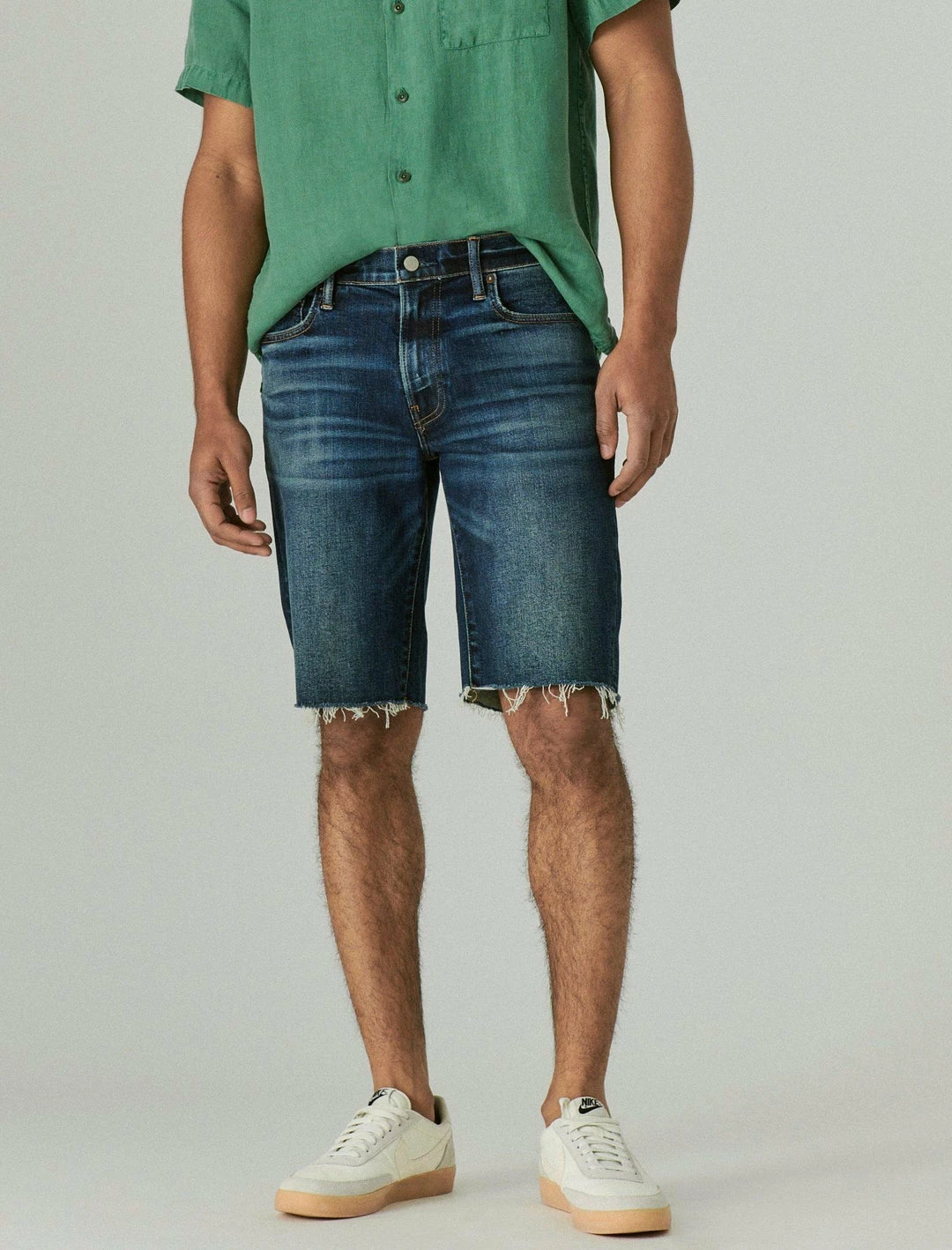 Our slimmest-fit short, the Athletic Slim has an easy mid rise and ample stretch perfect for athletic builds. Finished with raw edge frayed hems, this dark vintage wash denim short is ready to pair with your favorite graphic tee.Mid rise with a slim fit. Dark vintage wash denim. Advanced stretch for a comfortable modern feel in a high-stretch fabrication. 5-pocket styling with button-and-zip fly. 7″ inseam
