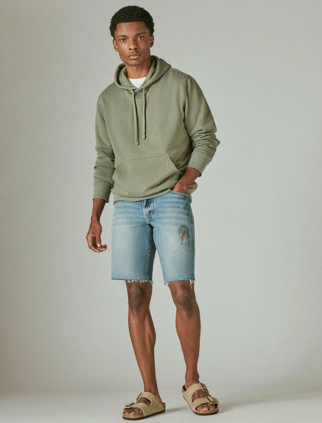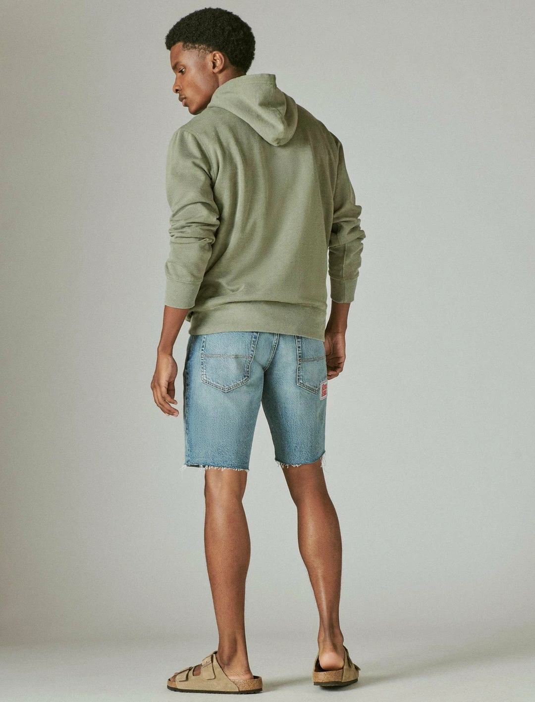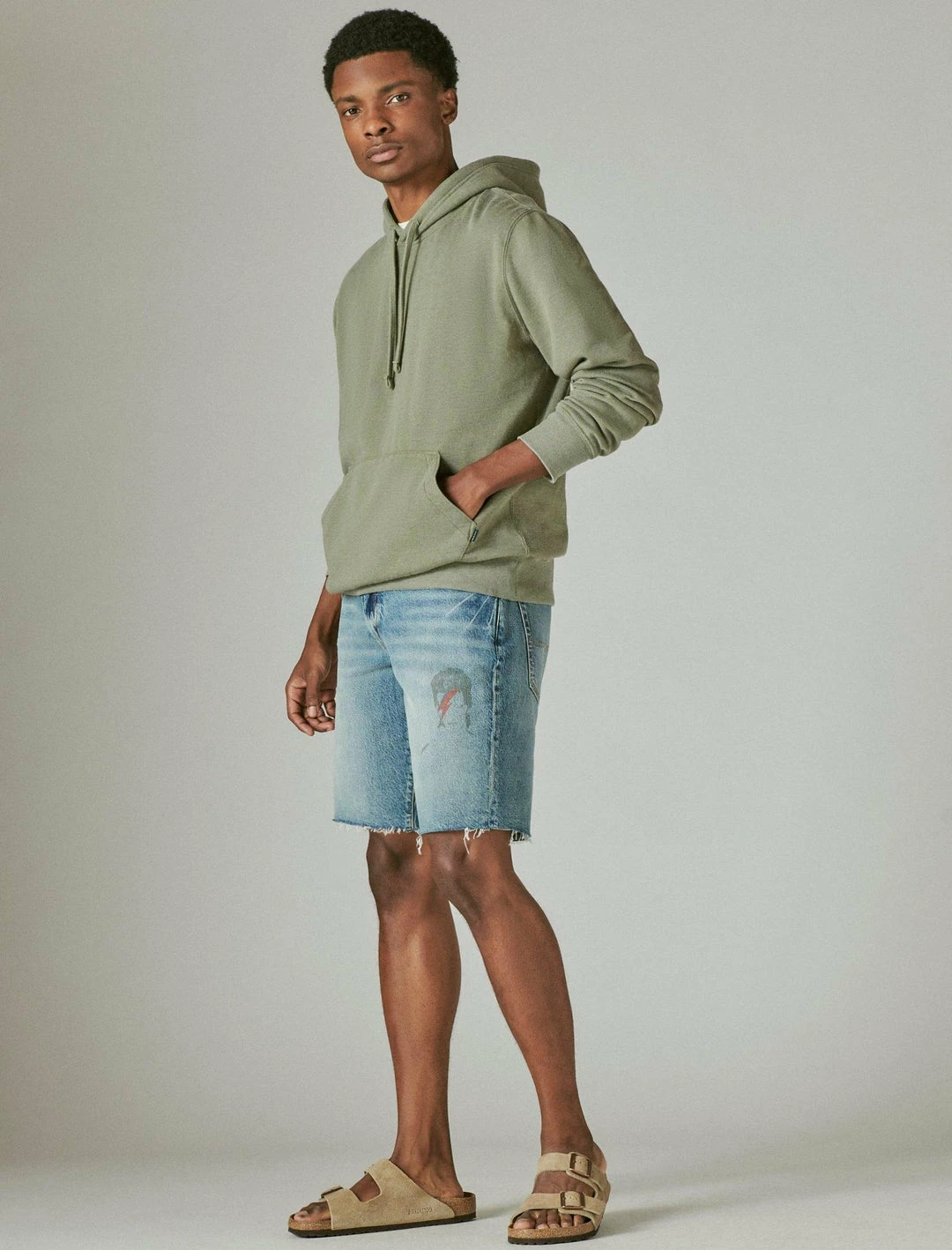 Perfect for athletic builds, the Athletic Straight short balances a mid rise with a straight fit, complete with frayed hems in distressed light wash denim. From our limited edition Lucky Legend collection, this pair features iconic David Bowie graphics and patches for your own authentic style.Mid rise with a straight fit. Distressed light vintage wash denim. Comfort stretch with just the right amount of give. 5-pocket styling with button-and-zip fly. 9″ inseam