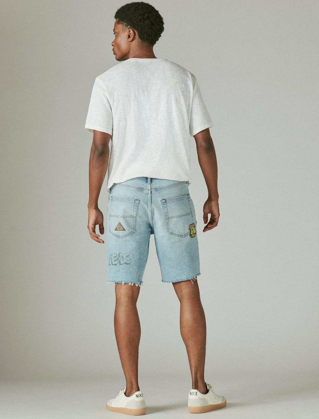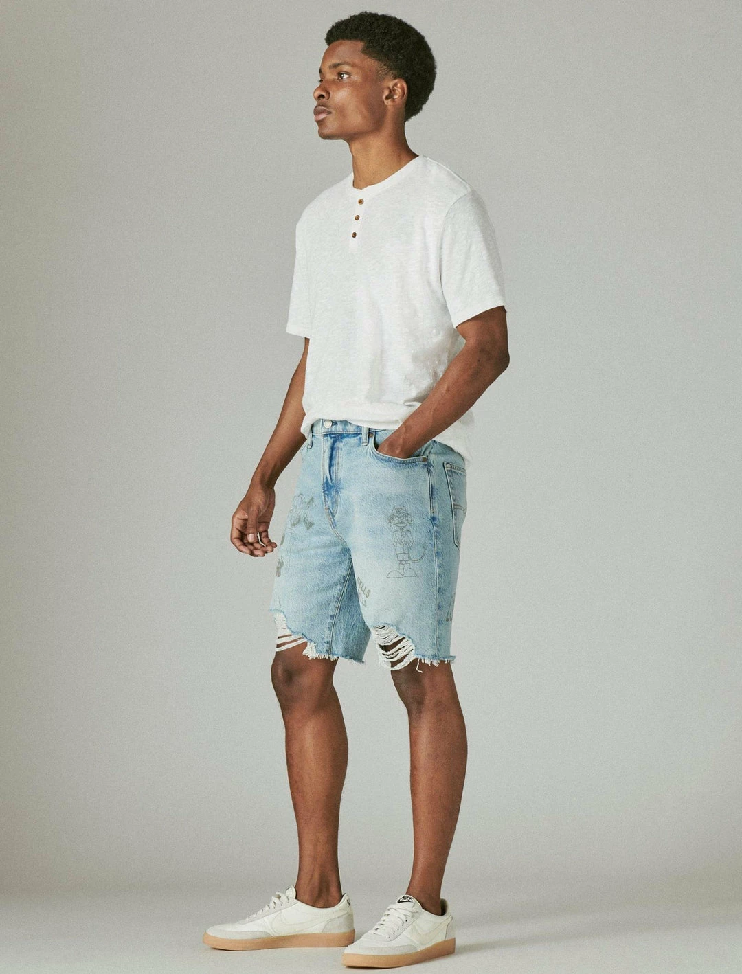 A vintage-inspired jean short with an easy mid rise and relaxed fit, our Vintage Loose short features frayed hems with rips and tears for added edge. From our limited edition Lucky Legend collection, this unique pair showcases ACDC motifs throughout for a unique look.Mid rise with a relaxed fit. Distressed vintage light wash denim. Comfort stretch with just the right amount of give. 5-pocket styling with button-and-zip fly. 9″ inseam