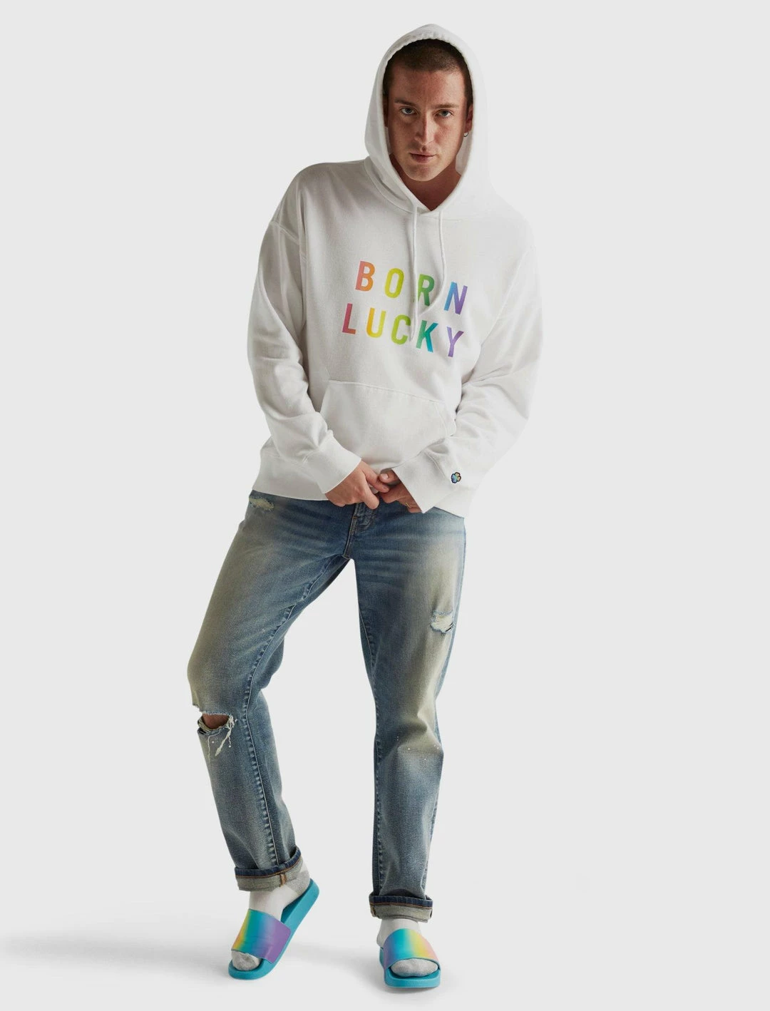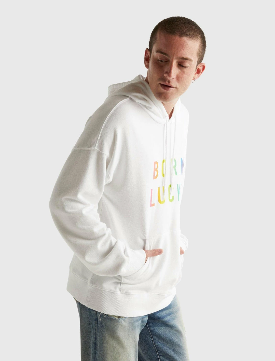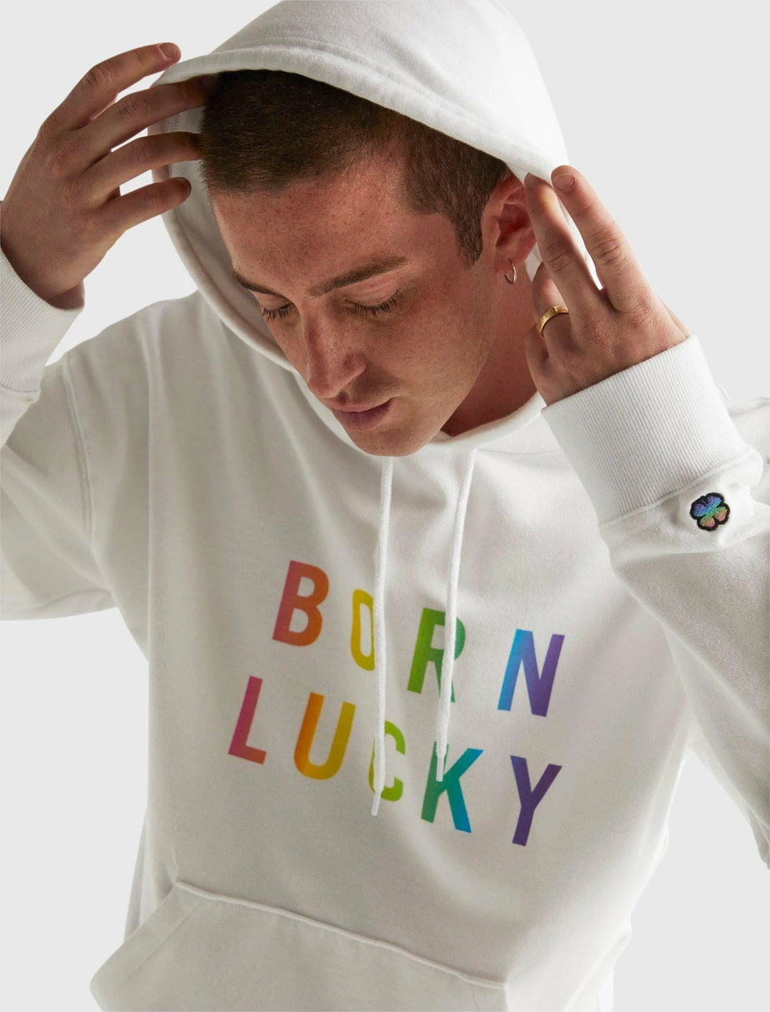 Show your pride in this unisex hoodie sweatshirt from our limited edition Born Lucky Pride Capsule collection, crafted from a soft and smooth cotton blend and featuring bold rainbow gradient lettering. Drawstring hood. Long sleeves. Kangaroo pocket