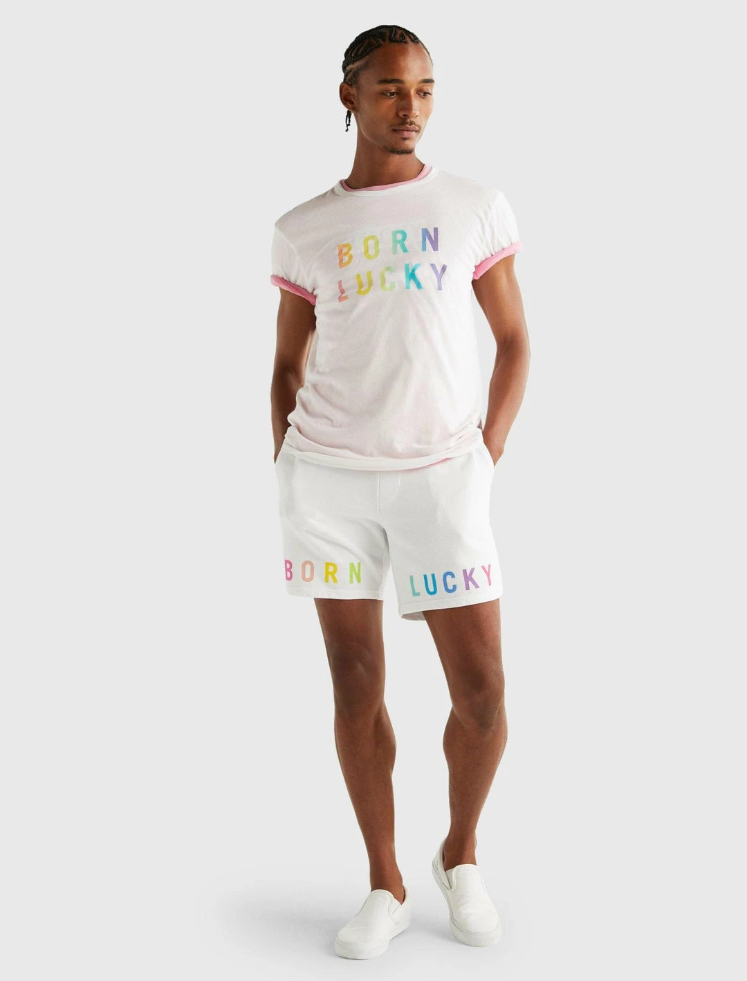 Try your luck with this simple graphic tee from our Born Lucky Pride capsule collection, cut from a soft and durable cotton with a bold rainbow letter print. Get some extra credit and pair with matching shorts. Crew neck. Short sleeves