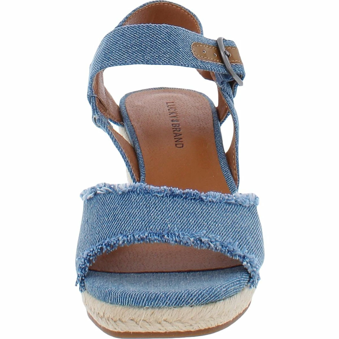 Be in the moment with the Mindra wedge sandal by Lucky Brand. This shoe is made up of frayed canvas uppers. It features an adjustable buckle closure on ankle strap and a cushioned footbed for comfort. Its wedge heel measures 3″ and platform measures .5″.