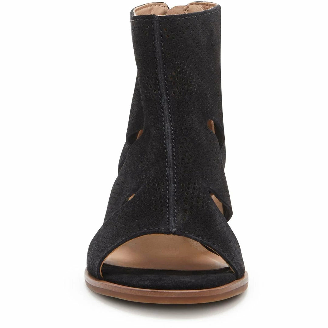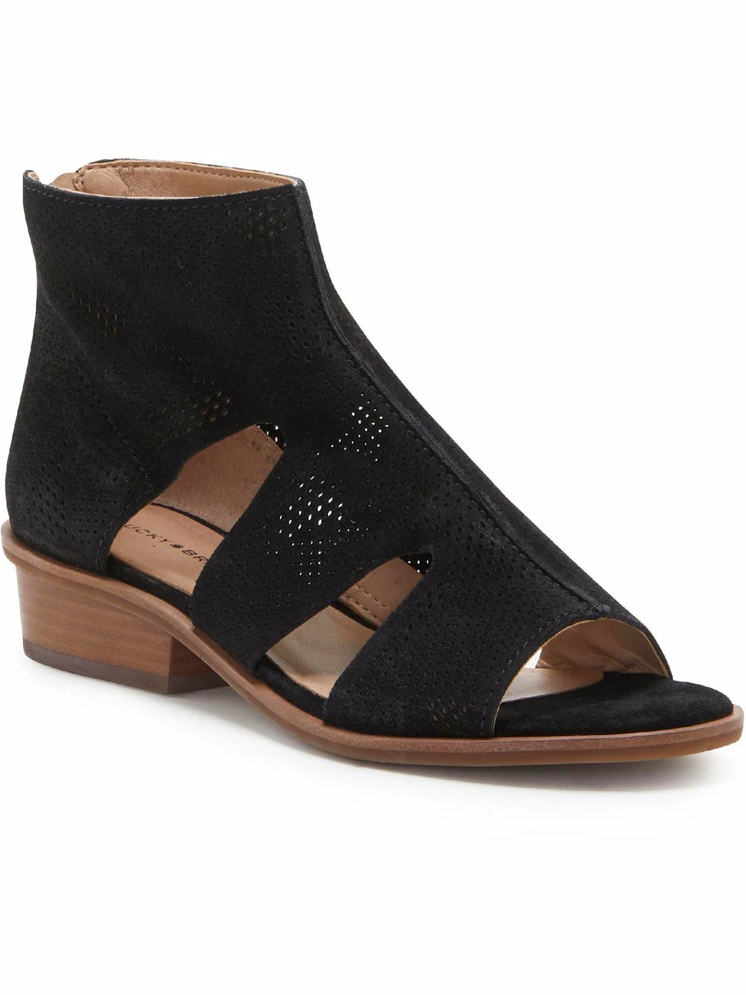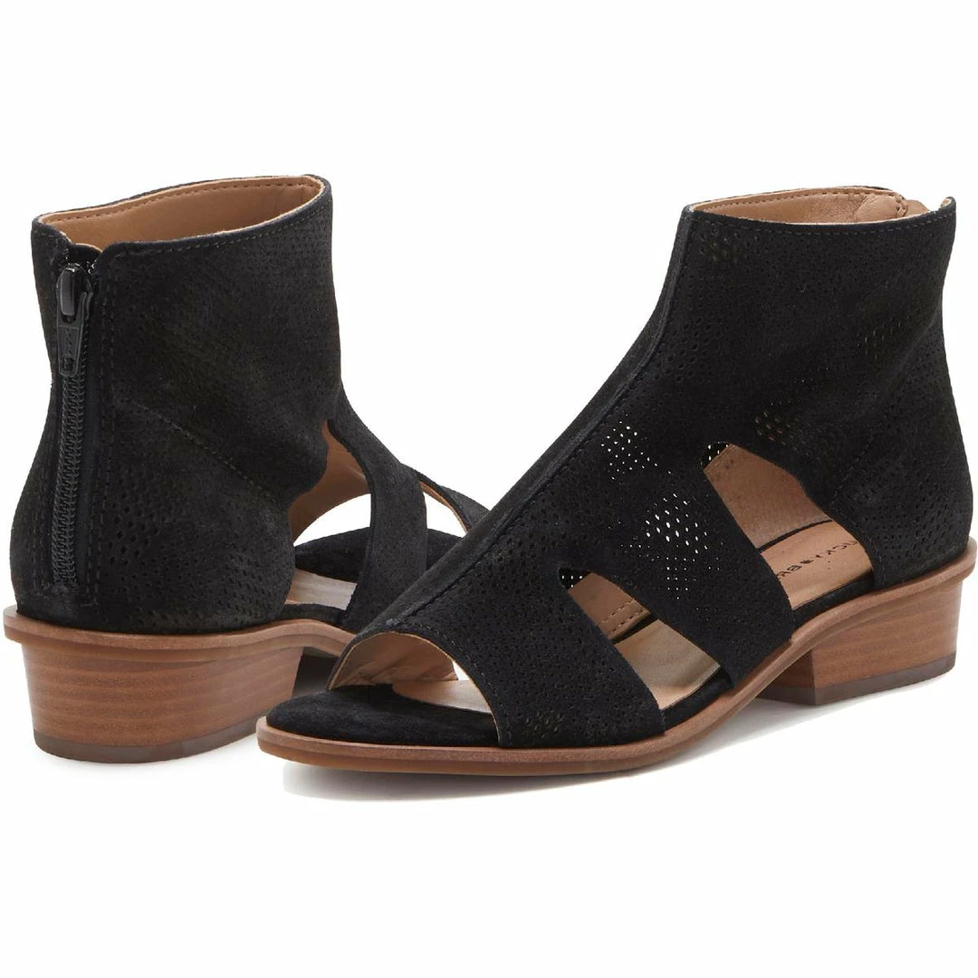 Dress up your warm weather look in the Breezy sandal by Lucky Brand. Made of suede uppers with textile lining. Zip back closure & padded footbed for easy wear. Perforation and cutout details throughout upper. Rubber outsoles with 1 1/4″ heel.