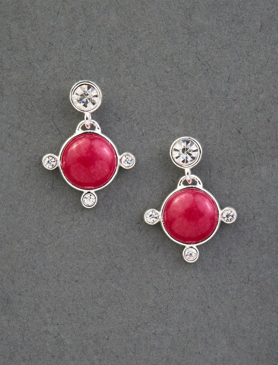 Round-cut jade stones in three-prong settings bring a boho touch to these sparkly studs framed by sterling silver.Sterling silver with semi-precious stone. Post fastening for pierced ears. 3. 4″ high