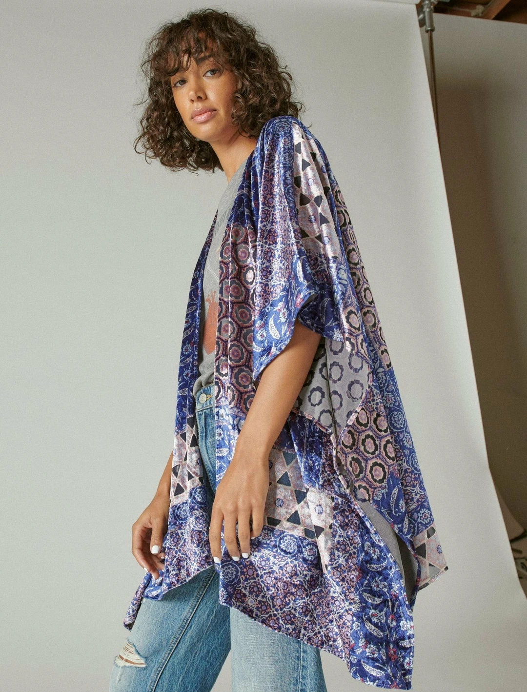 Drape yourself in this classic kimono updated with a beautiful burnout velvet geometric and paisley pattern. Pair with an easy music graphic tee for all the Stevie Nicks vibes.Open neck. 3. 4 sleeves