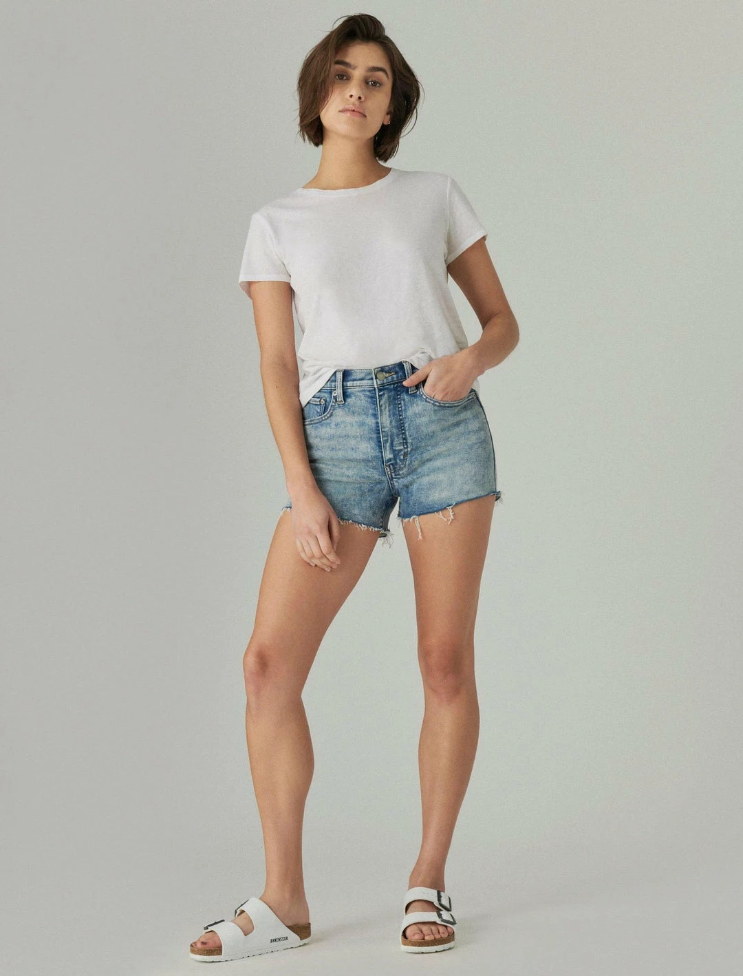 Style an endless amount of looks with our High Rise Curvy short. Our newest skinny fit crafted with soft sculpting stretch, this distressed denim style pairs perfectly with vintage-wash tees, textured knits and everything in between.High rise with a skinny fit. Distressed light wash denim. Crafted with Lucky Free Stretch, a soft and easy sculpting stretch. 5-pocket styling with button-and-zip fly. 3″ inseam