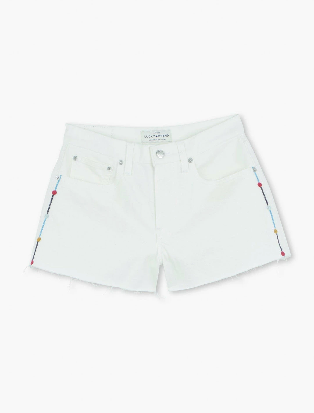 When the weather heats up, you’ll love the comfortable, looser fit of our Boyfriend Shorts.Light wash denim. Colorful side details. Raw cut hem