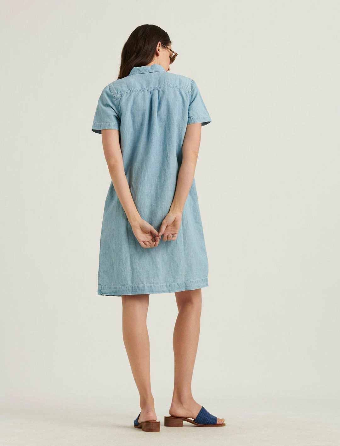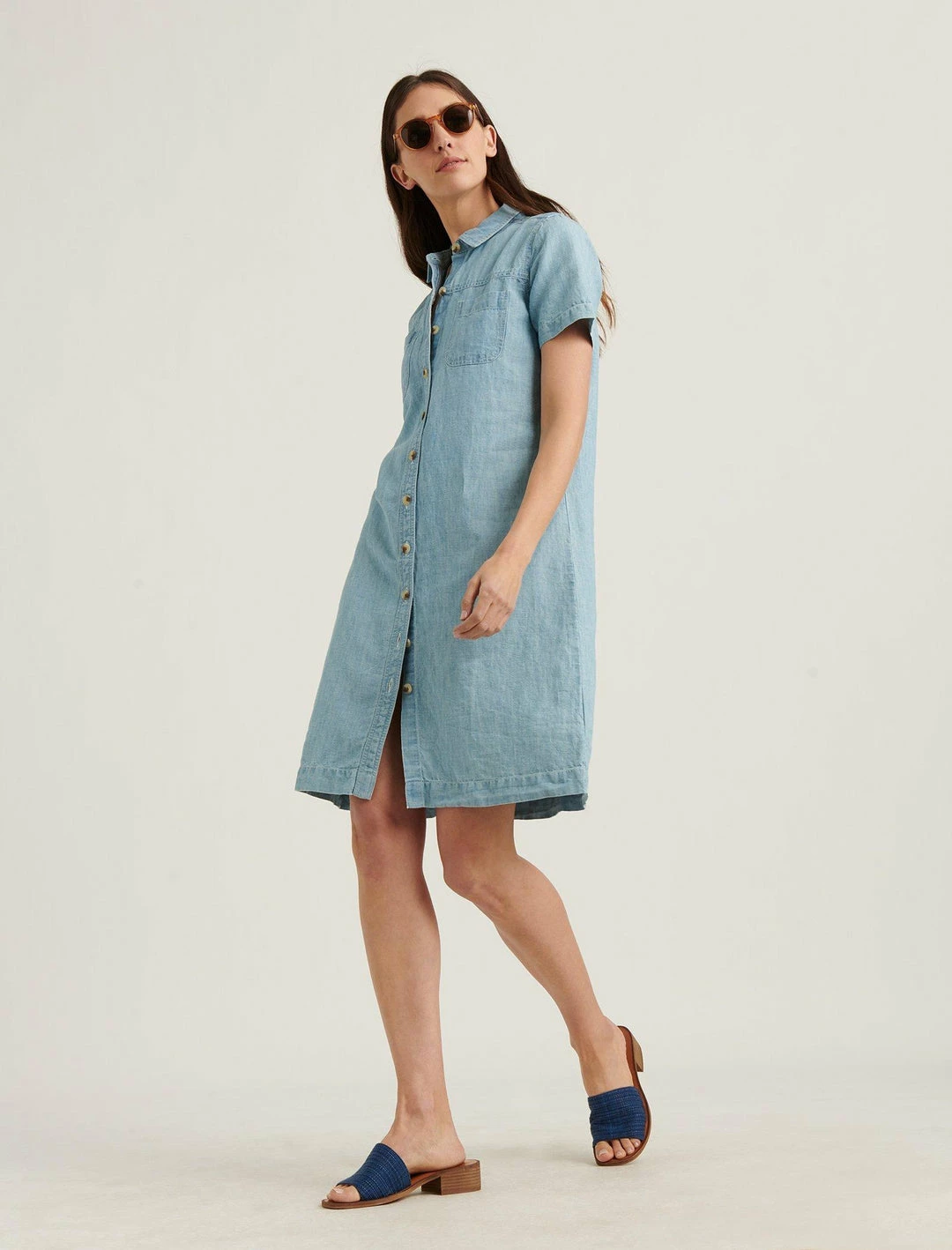 Get ready for the warm days ahead with this chambray dress featuring accent buttons.Button down. Two chest pockets. Collar. Button down. Short sleeves