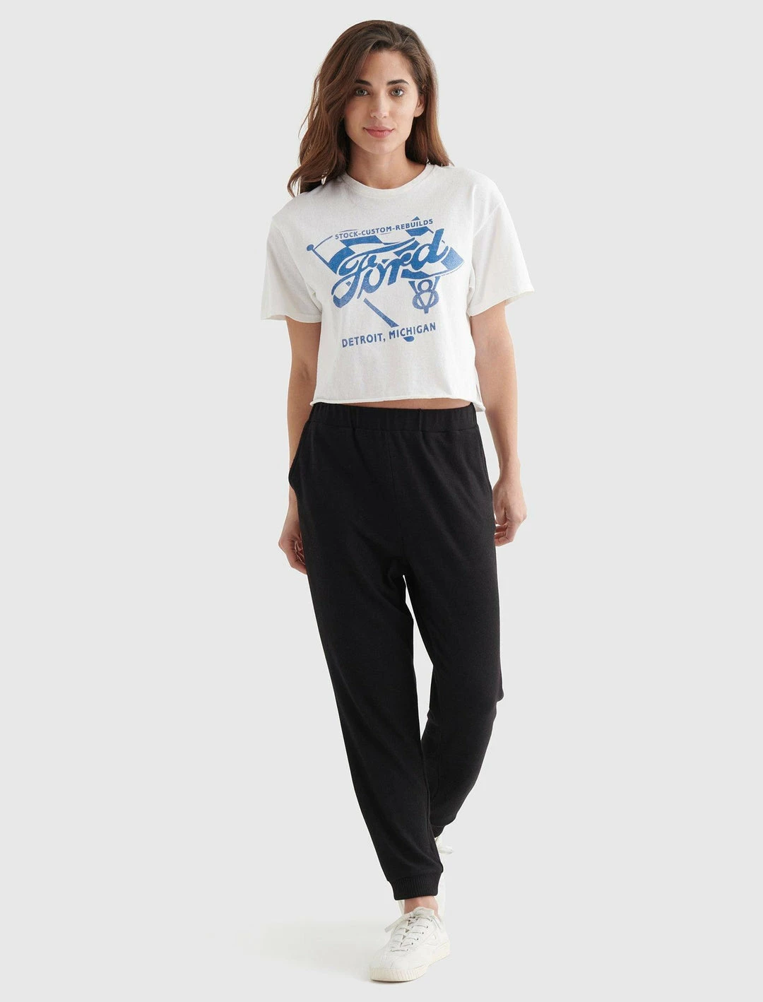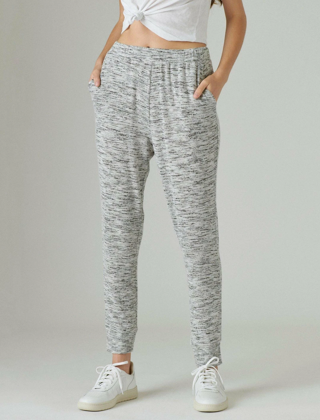 Take it easy in these super-soft cloud jersey joggers. Cut for a loose fit, they feature a comfortable elastic waist, side slant pockets, and stay-in-place elastic cuffs. Wear with a tank and long cardigan. Mid rise. Elastic waist . Side slant pockets