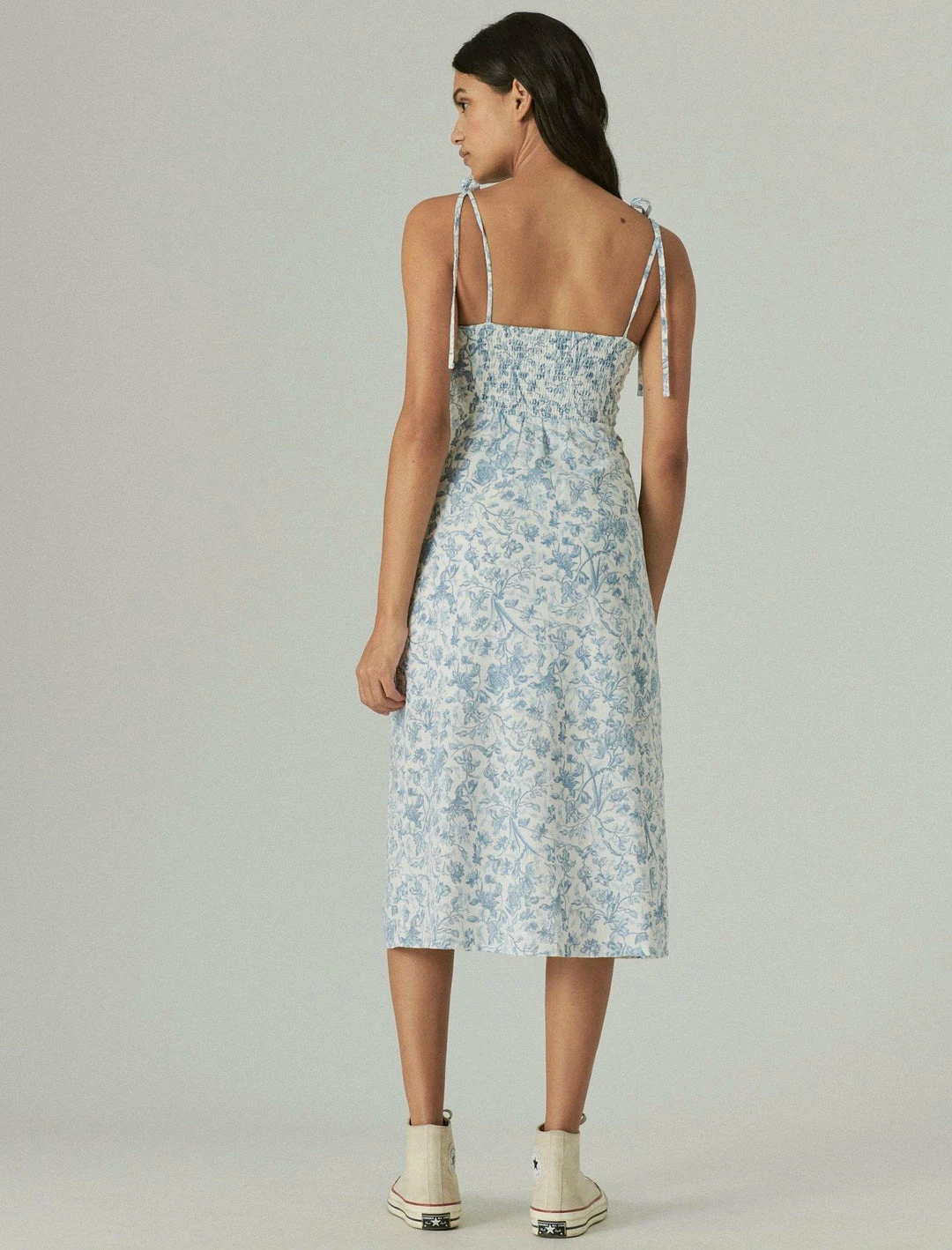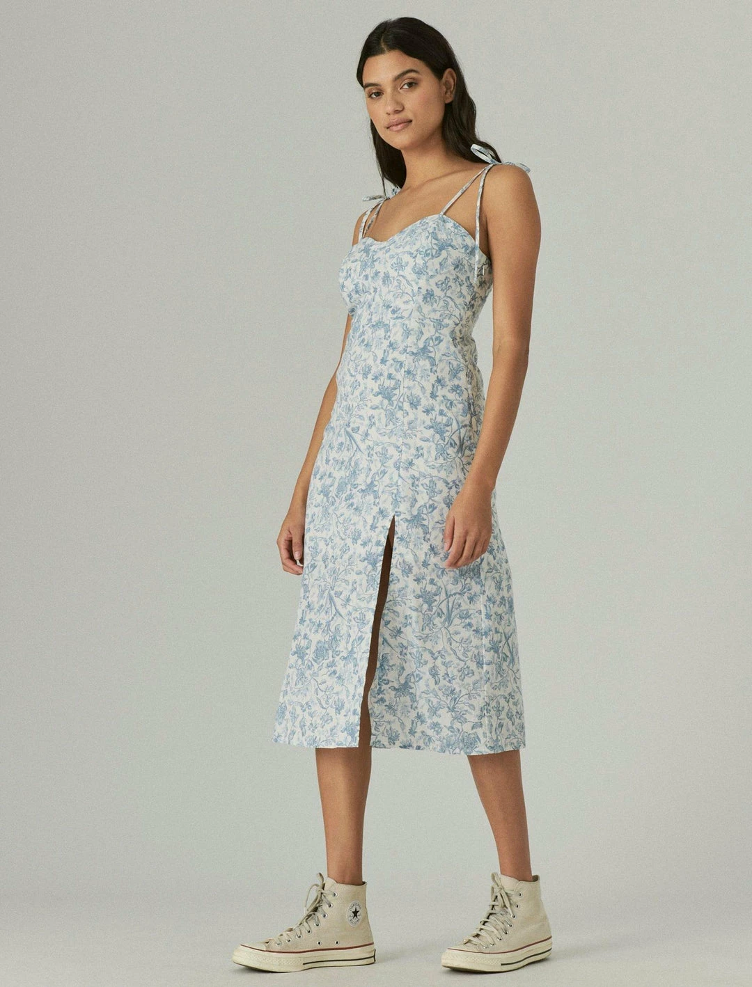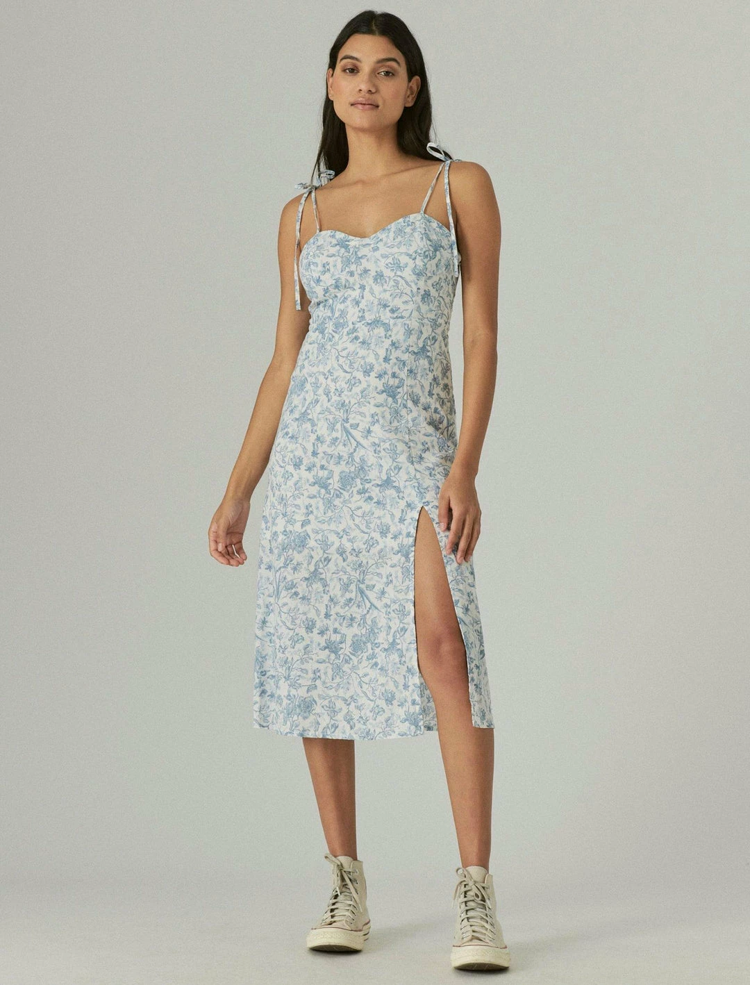 A corset-style bodice and side leg slit add a flirty touch to this printed midi dress featuring tie shoulder straps and a stretchy smocked back.Sweetheart neck. Sleeveless