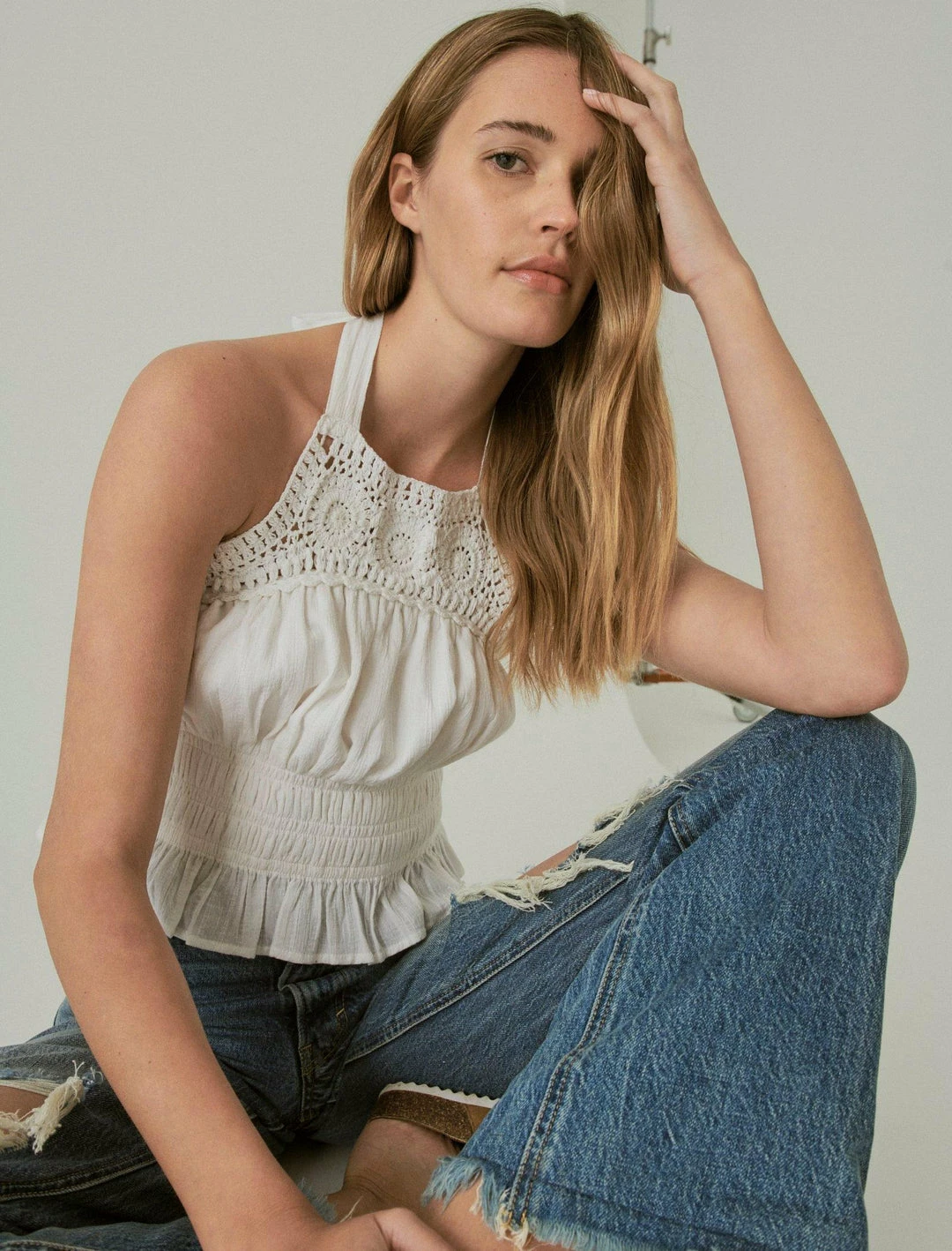 Summertime and the living is easy in this bright white halter top featuring special details like a stunning crochet design, smocked waist and flared ruffle hem.Halter neck with adjustable tie. Sleeveless. Smocked waist