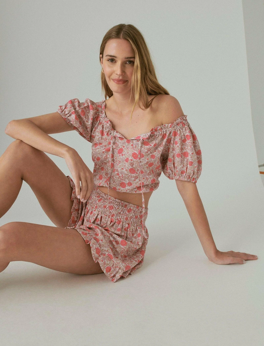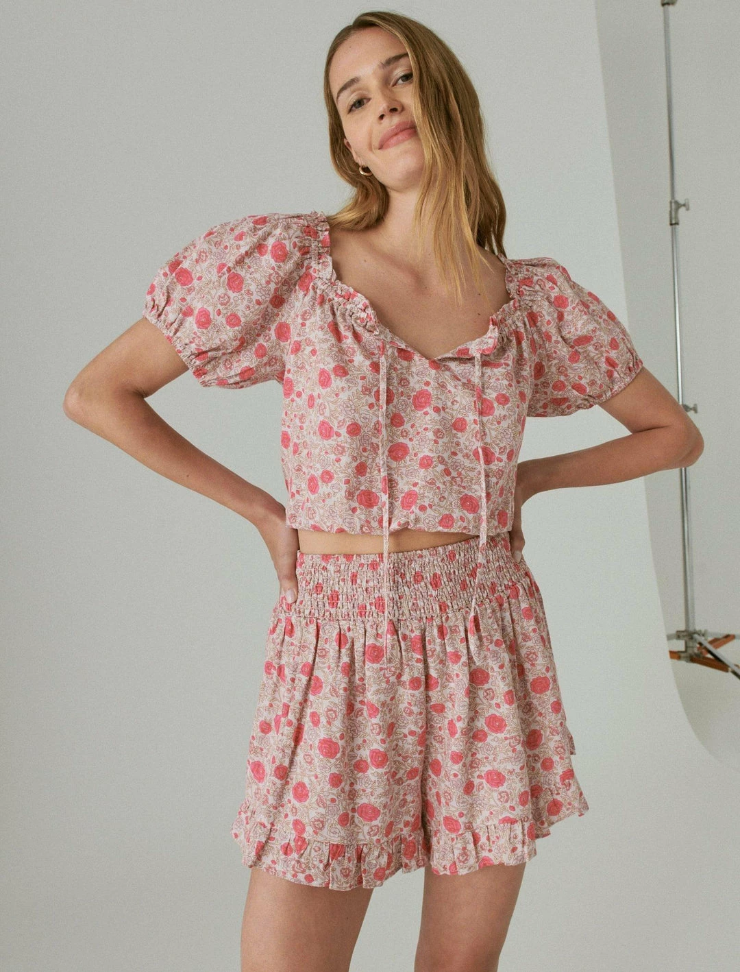 So pretty in print, this floral matchback top features drawstring detail at the split neck and short puff sleeves in a cute cropped silhouette. Wear yours with its coordinating matchback skirt for effortless summertime style.Split neck with drawstring ties. Short sleeves. Elastic cuffs and waist