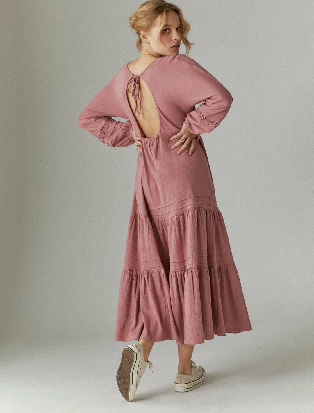 Designed with a full button front, this so stunning knit maxi dress brings boho vibes with special embroidered details throughout and an open back with adjustable drawstring ties.V-neck with button front. Long sleeves