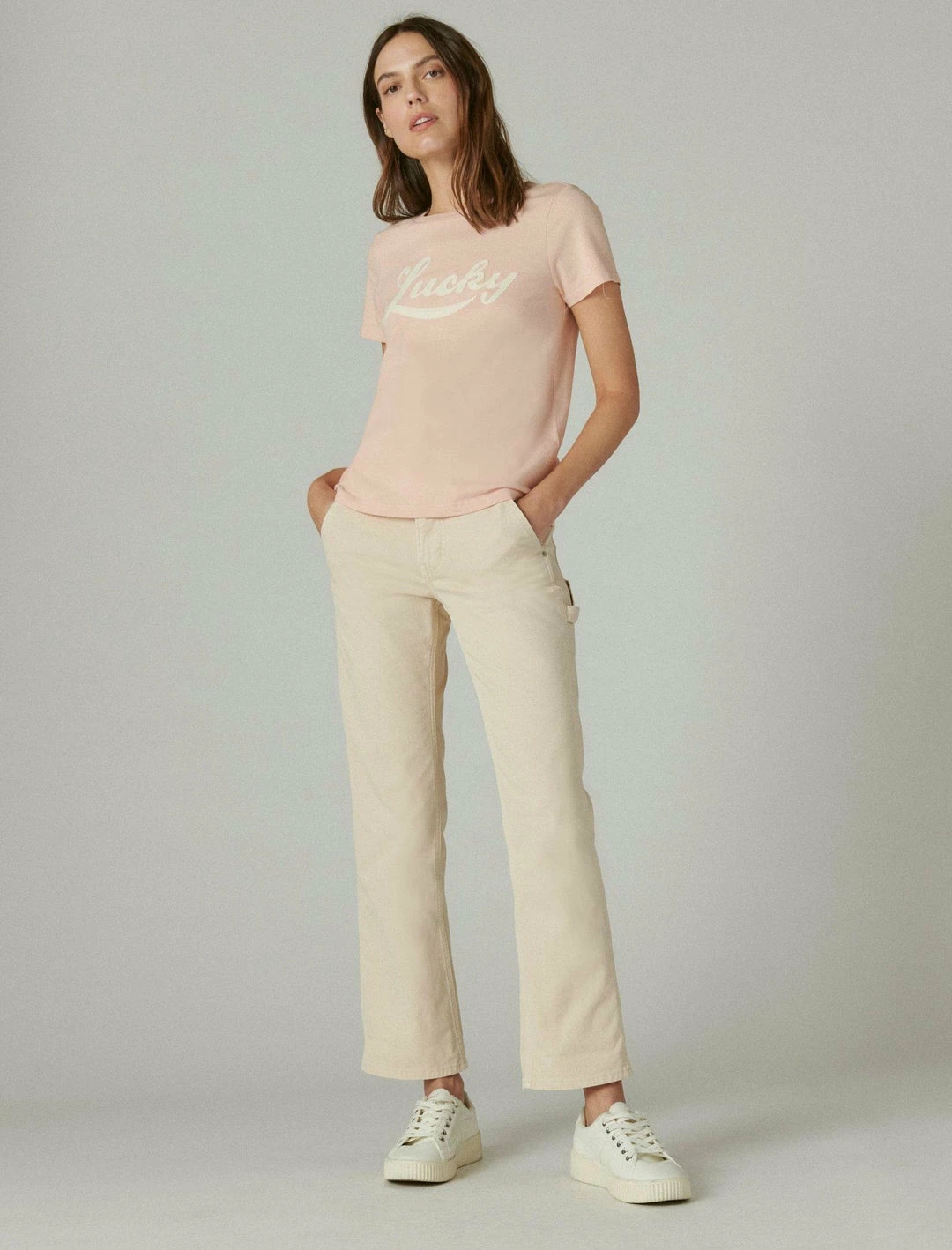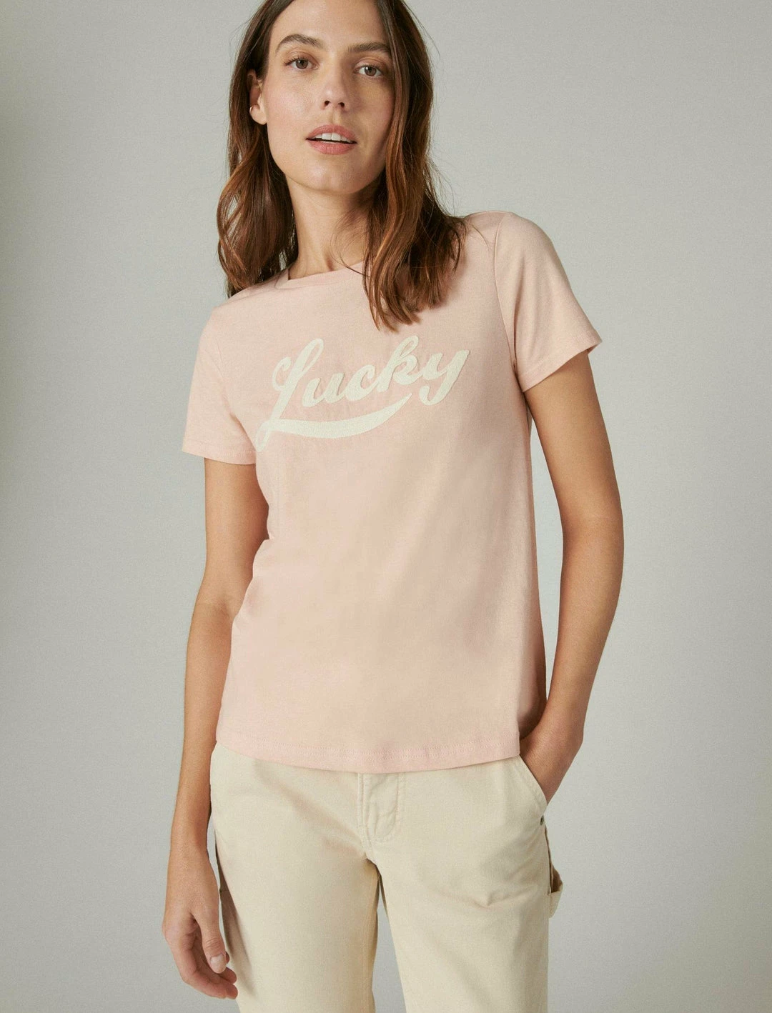 So effortlessly special, this crewneck tee is perfect for any occasion, featuring a classic silhouette with an embroidered Lucky graphic at the front for added dimension.Crew neck. Short sleeves