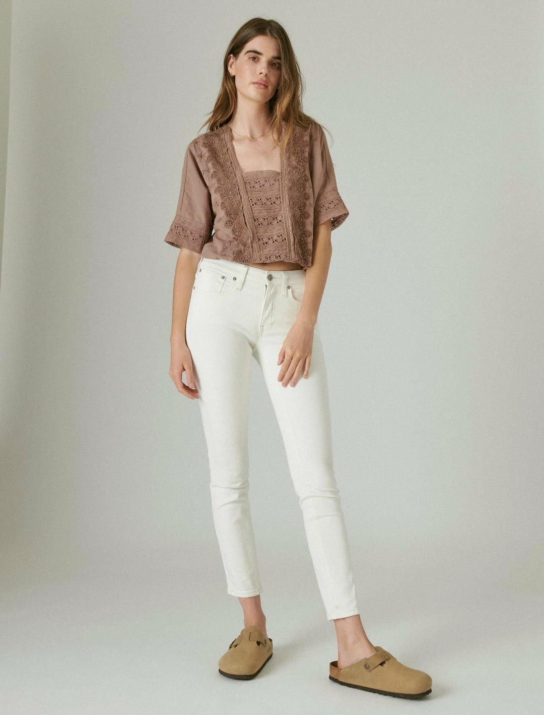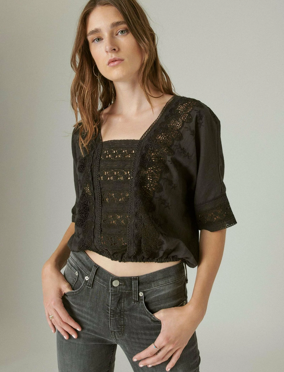 Add a feminine touch to your look with this dreamy top crafted in soft, 100% cotton fabric that’s detailed with lace insets and a modified square neckline. Layer it over an essential cami for the ultimate romantic look. Square neckline. 3. 4 sleeves