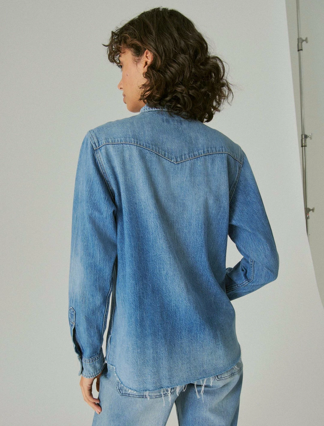 Inspired by the handcrafted heritage of authentic American denim, this original heritage shirt is crafted in distressed vintage-wash cotton and features traditional tailoring like a spread collar, classic button-down styling and chest pockets. From our limited edition Lucky Legend collection, this shirt looks great layered over an easy graphic tee or button-up shirt.Button-down with spread collar. Long sleeves. Medium vintage wash denim. Button-close chest pockets. Button cuffs