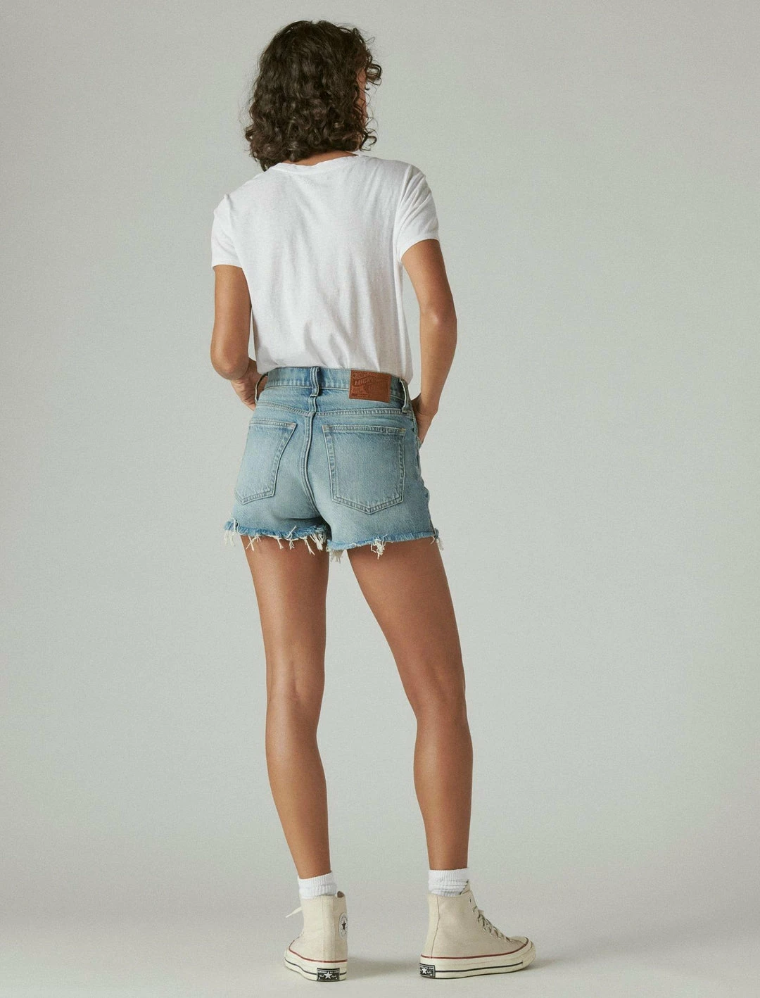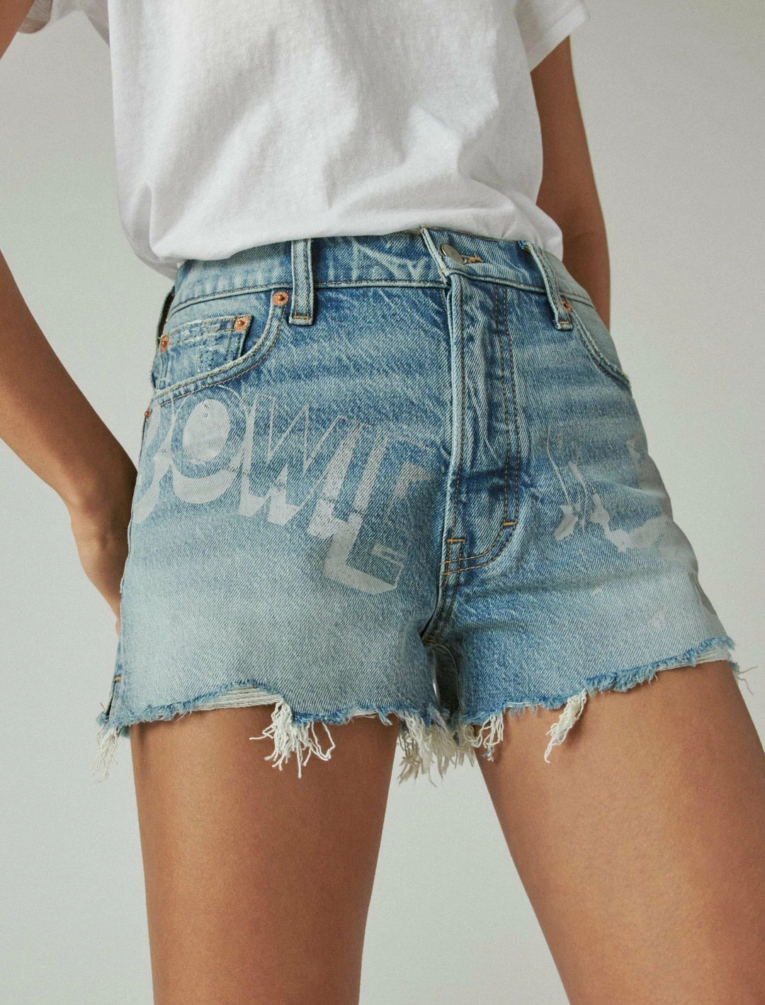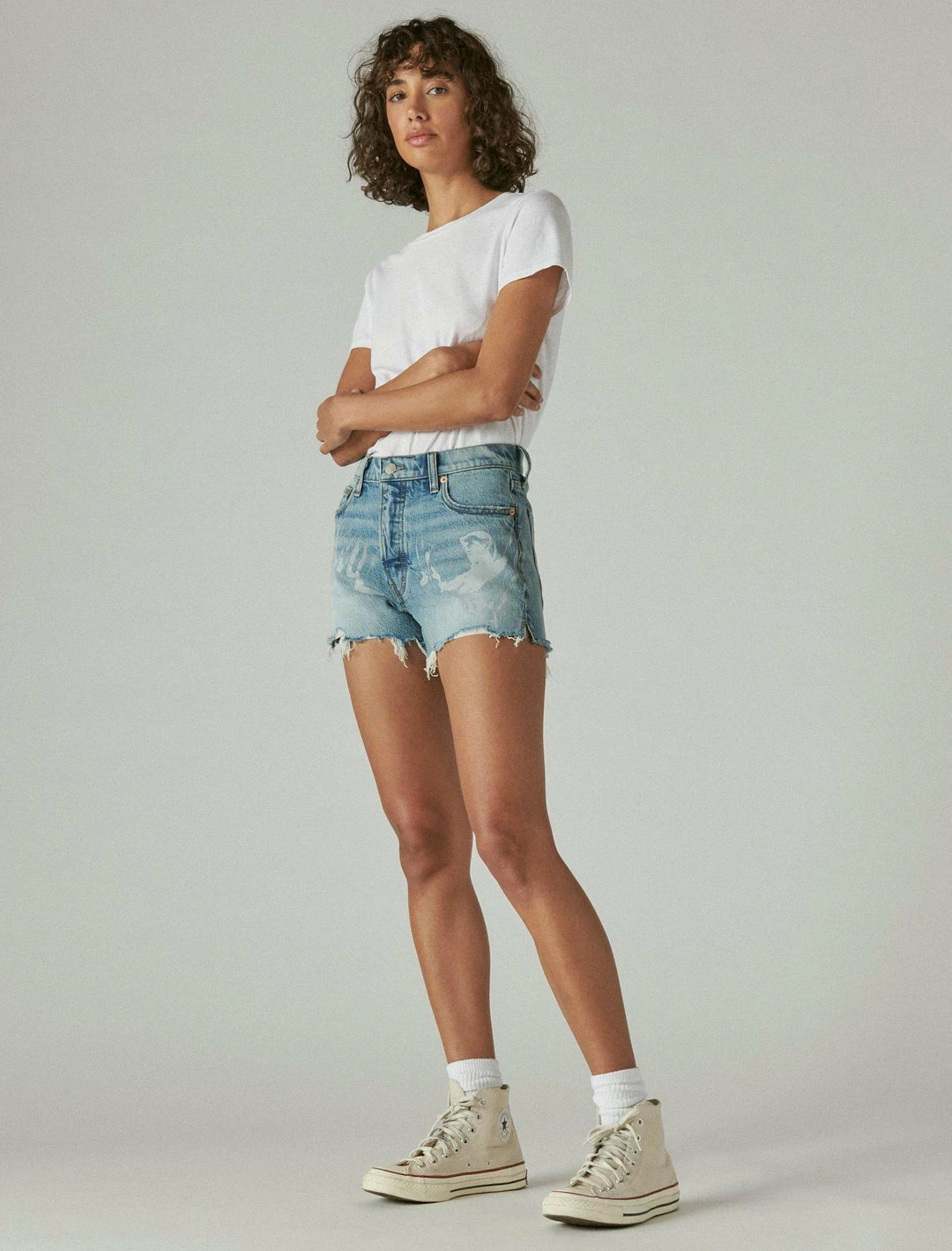 From our limited edition Lucky Legend collection, the retro-inspired High Rise Mom Short features a flattering high rise silhouette and skinny fit. Iconic David Bowie graphics and raw frayed hems add edge to your look, while a hint of stretch offers easy movement so you stay comfortable all day.High rise with a skinny fit. Light wash denim. Comfort stretch with just the right amount of give. 5-pocket styling with button-and-zip fly. 3″ inseam