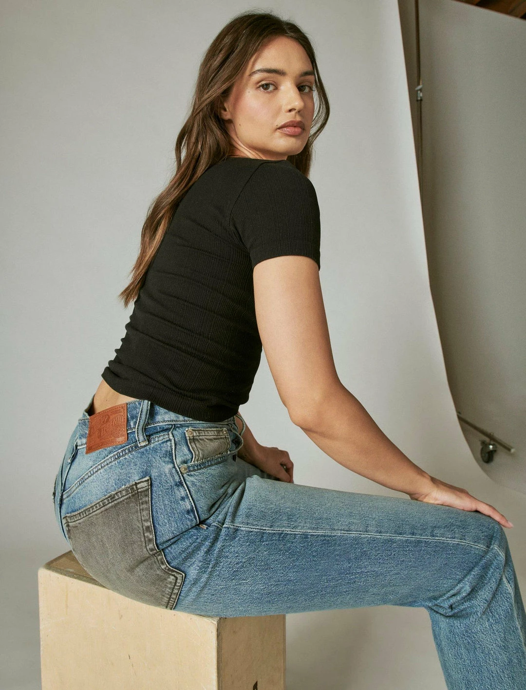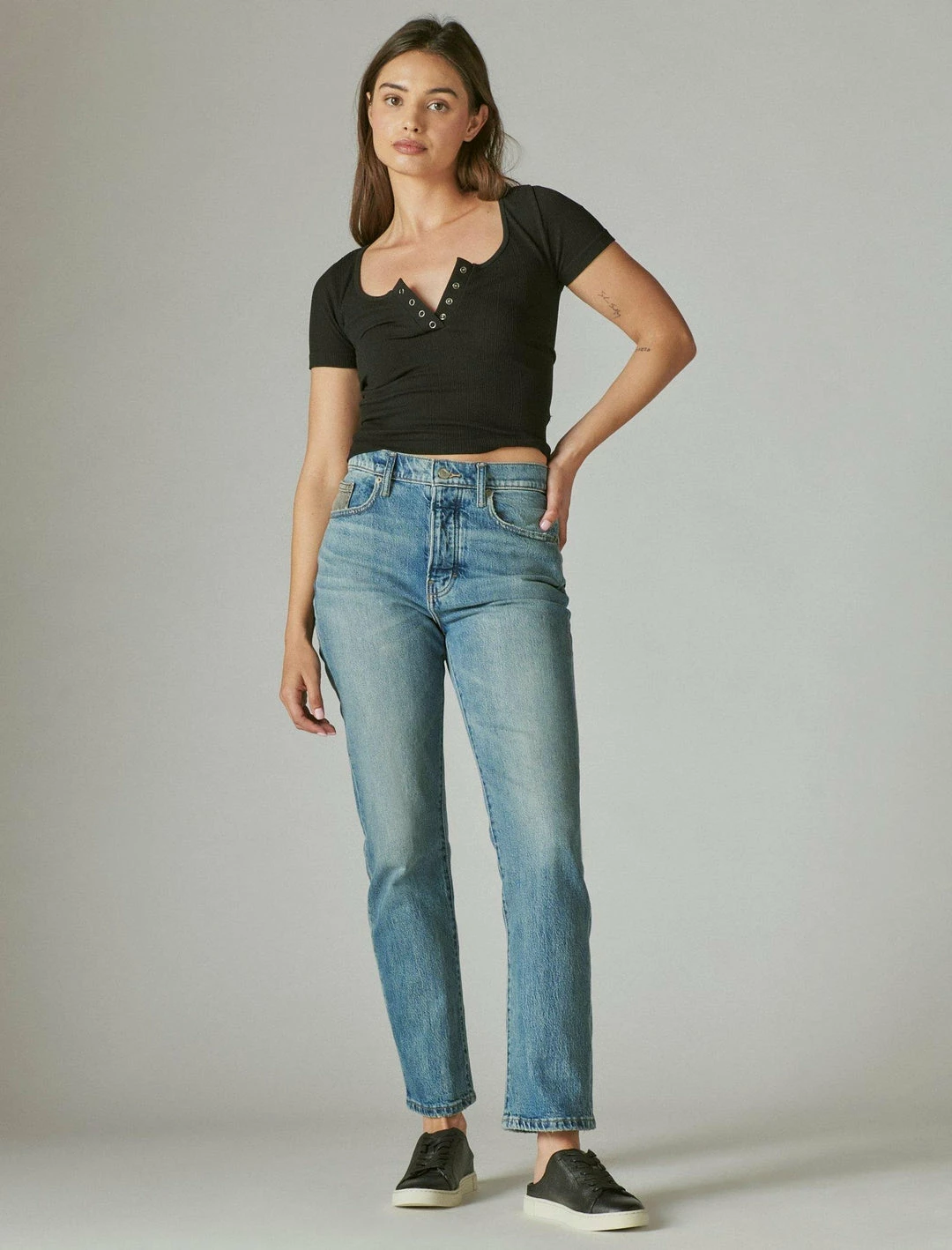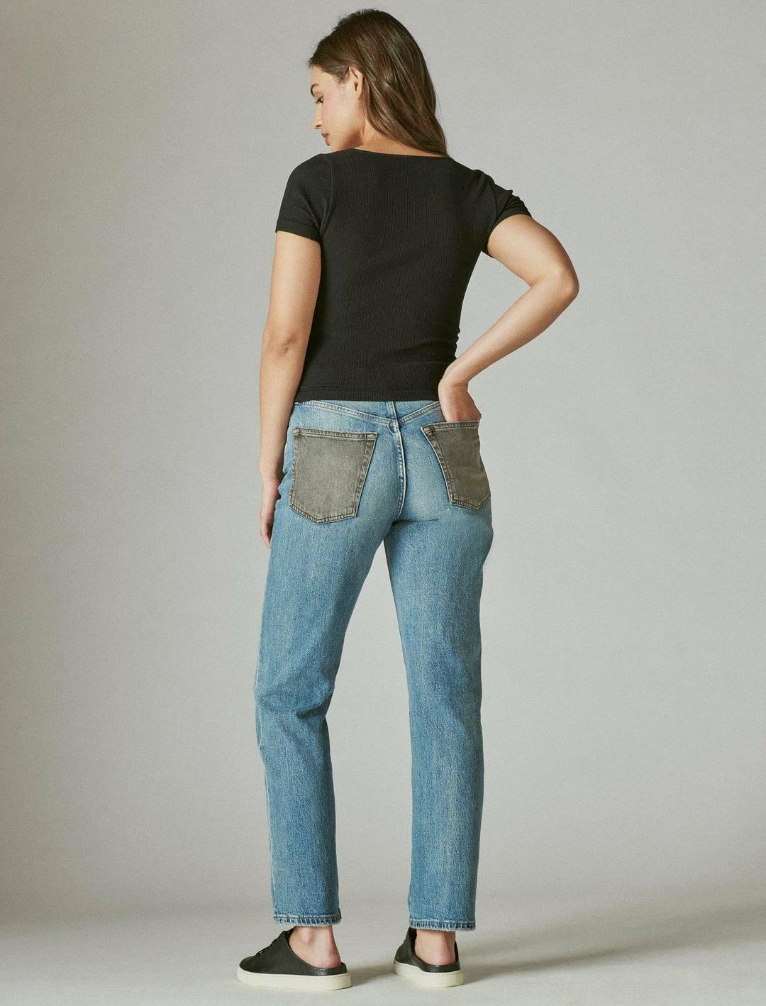 Take it easy in the retro-inspired High Rise 90s Loose jean, a modern update to a classic fit straight from hip to ankle with an easy relaxed leg. From our limited edition Lucky Legend collection, this vintage wash denim pair is finished with a bold color block design at the front and back pockets for your own authentic style.High rise with a straight fit and straight leg. Medium vintage wash denim. Comfort stretch with just the right amount of give. 5-pocket styling with button-and-zip fly. Rise – 11 3. 4 inches; Leg opening – 16 inches (size 27)