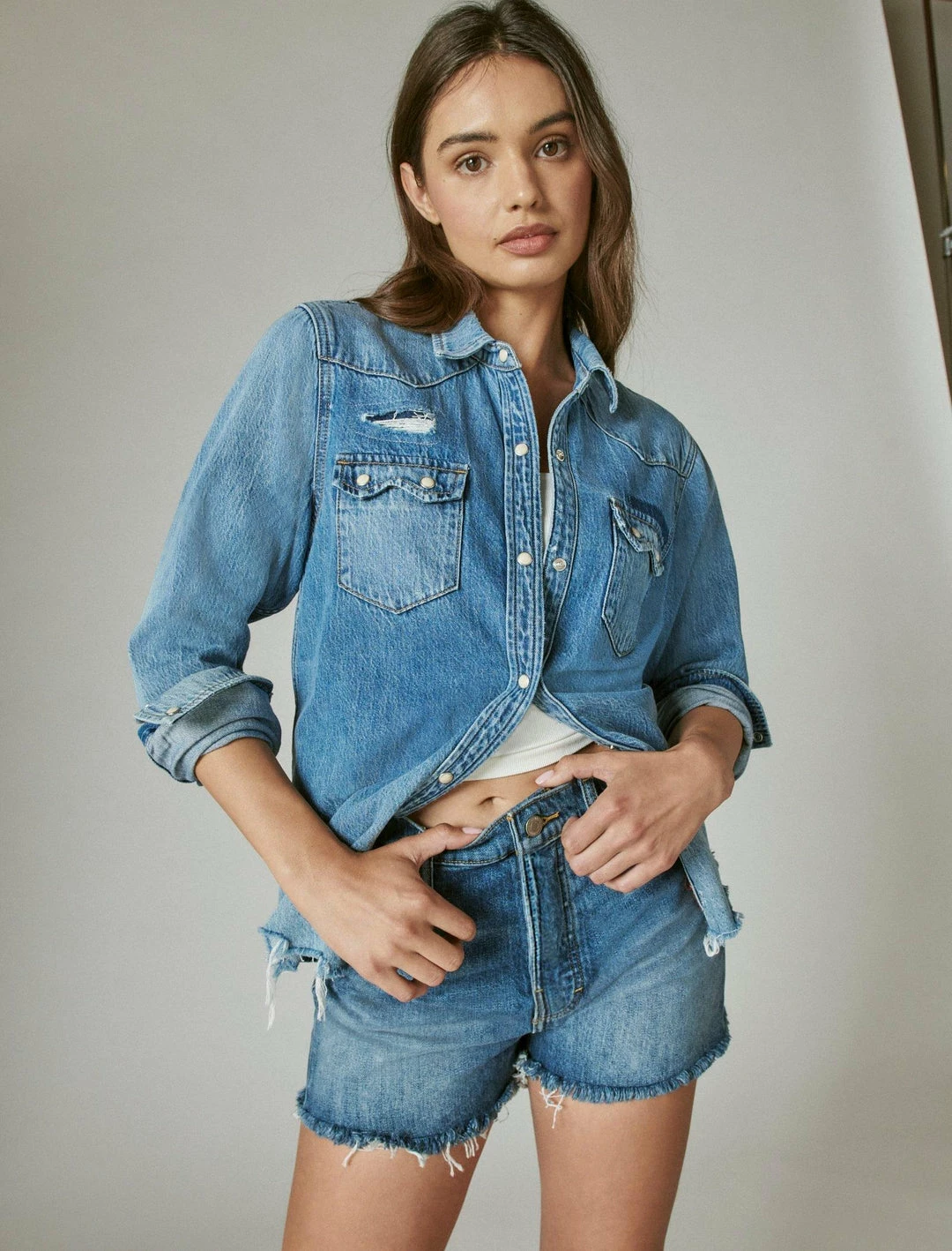 From our limited edition Lucky Legend collection, this ripped and repaired button-down shirt lends an authentic touch to any look with a front frayed hem and distressed details throughout. Layer over graphic tees and tanks for effortless style.Button-down with spread collar. Long sleeves. Snap-button chest pockets. Button cuffs