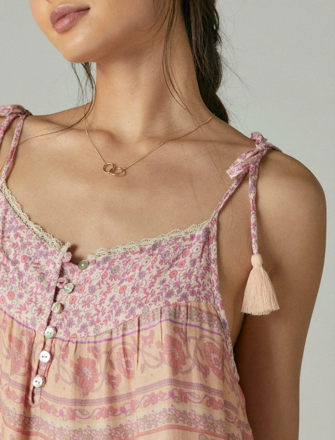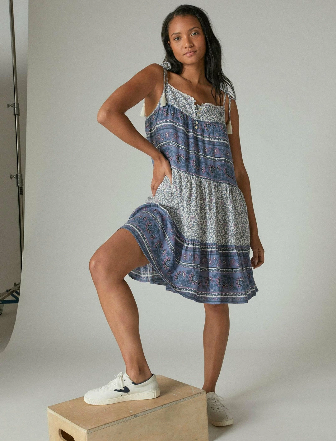 All-over mixed print and tassel-tipped shoulder ties bring boho vibes to this tiered dress featured in a lightweight cotton-knit fabrication. Pair with sneakers or sandals to complete the look.Scoop neck. Sleeveless