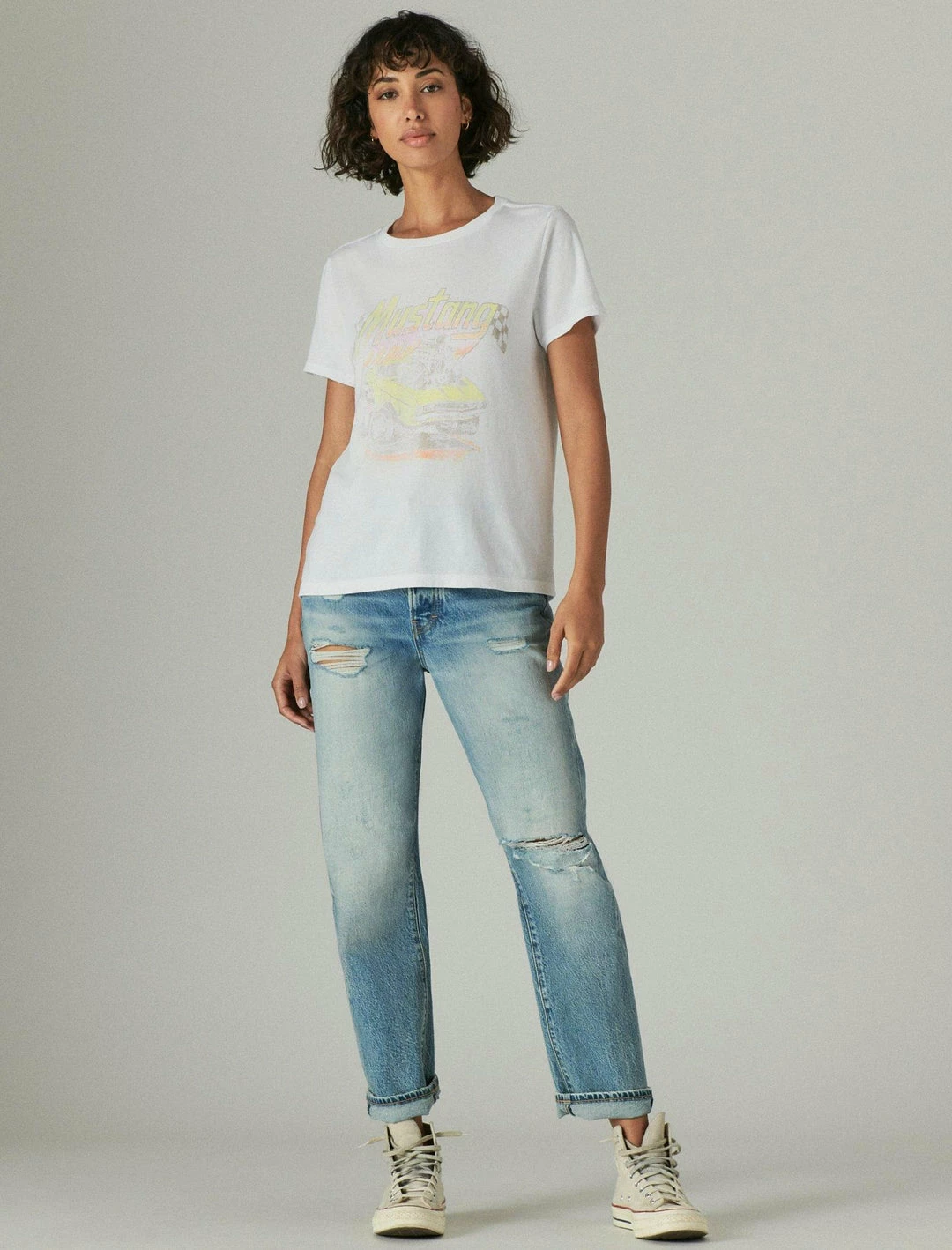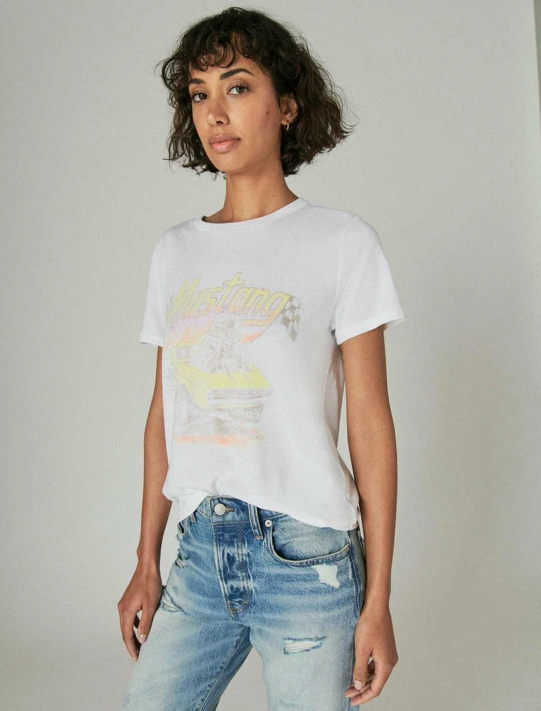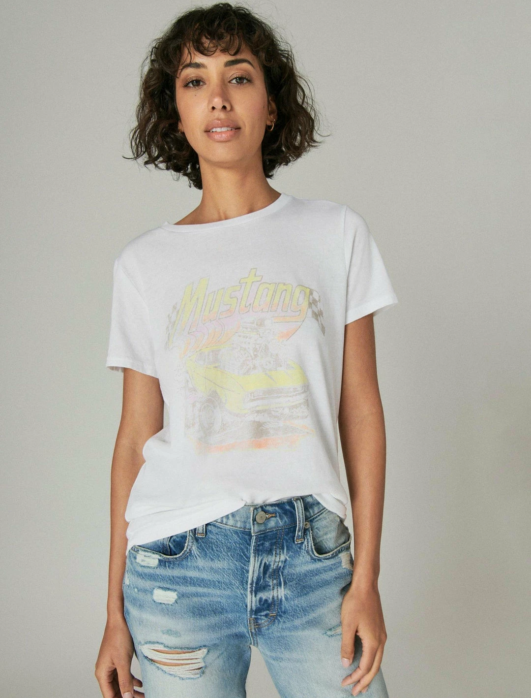 Designed for vintage style, this classic crewneck tee features a faded Mustang graphic at the chest in a soft cotton-blend. Pair yours with distressed denim jeans or shorts to complete the look.Crew neck. Short sleeves