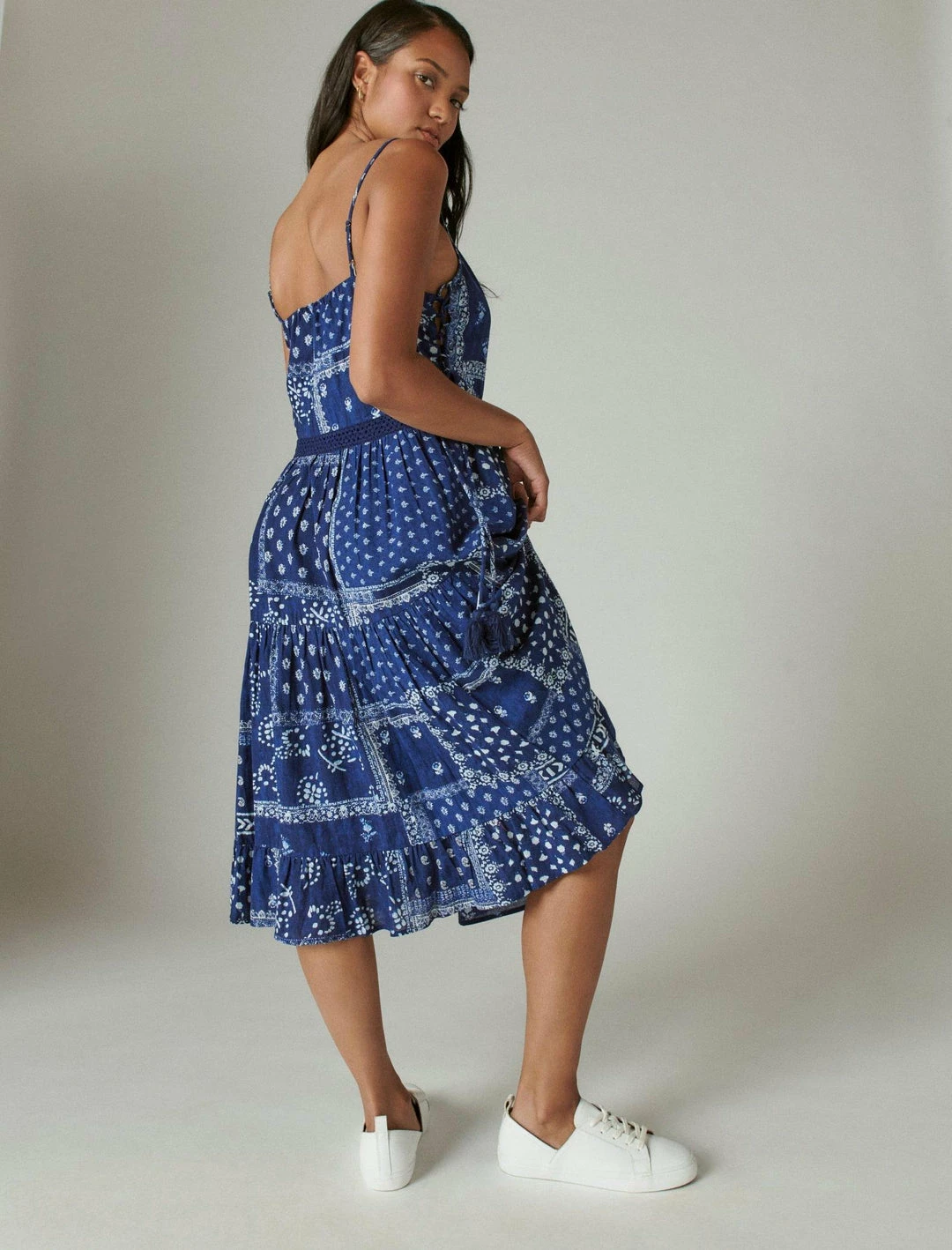 Forever timeless in a flowy tiered silhouette, this patchwork midi dress lends a boho touch with special details like a square neckline, lace-up side closure with hanging tassel ties and knit trim at the waist.Square neck. Sleeveless. Adjustable straps. Lace-up side with tassel ties