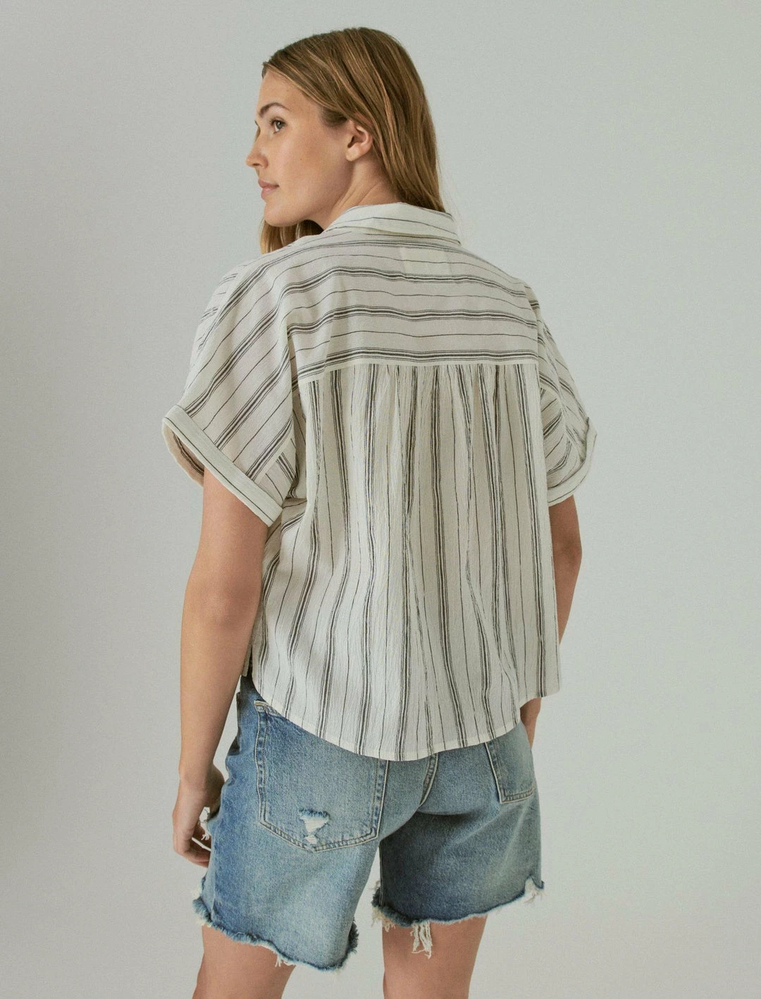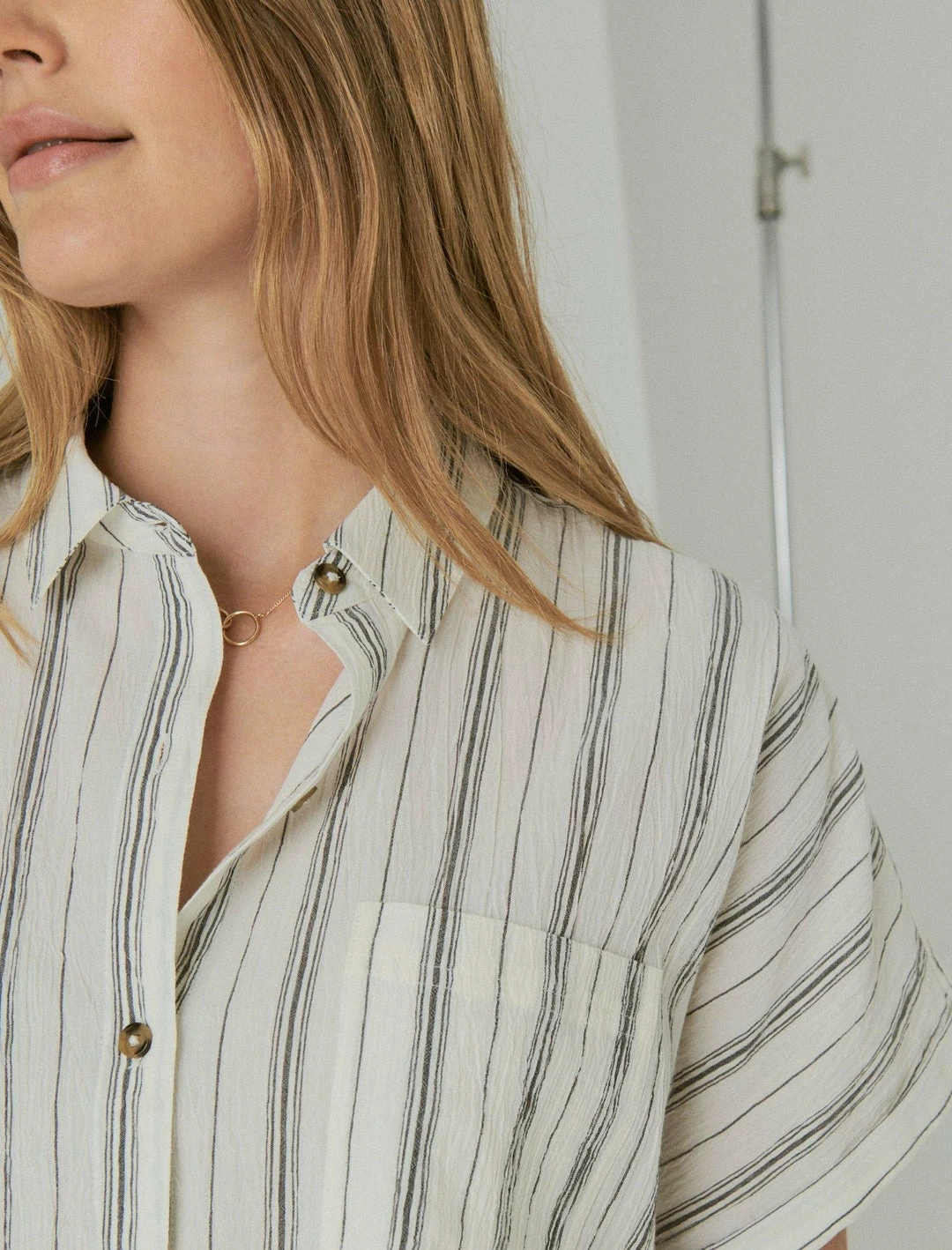 Add some easy style to your wardrobe with this short sleeve workwear shirt. Cut for a relaxed fit, this striped button-down features classic workwear detailing like a timeless spread collar and front patch pocket.Button-down with spread collar. Short sleeves. Chest patch pocket