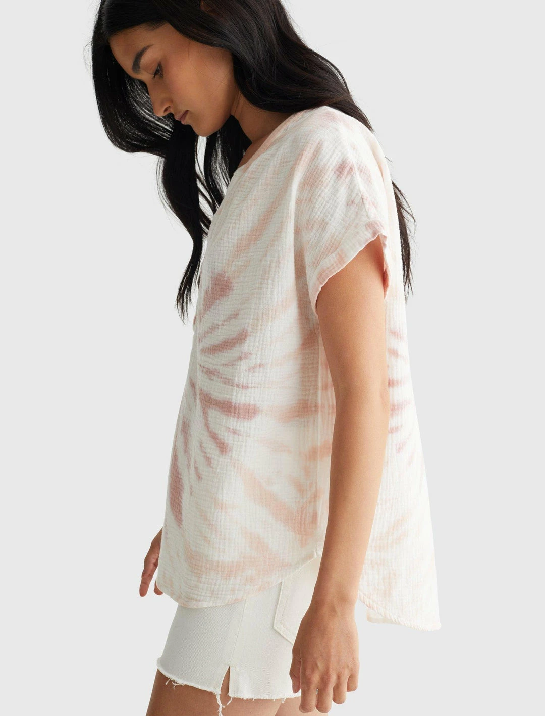 Open up and say yes to the subtle sophistication and easy comfort of this textured cotton top with a loose partially-buttoned open neck.Band collar with partial button closure. Short sleeves