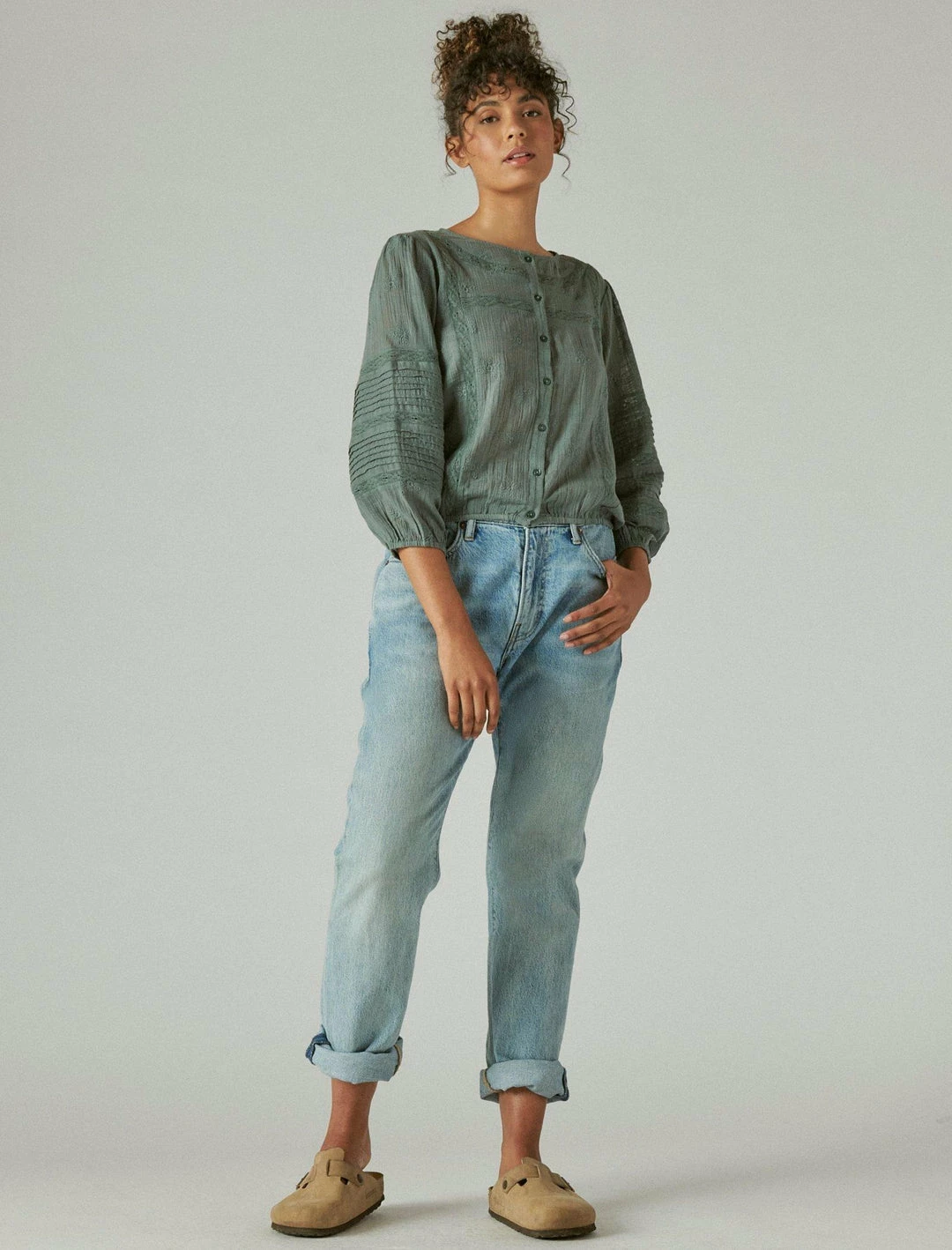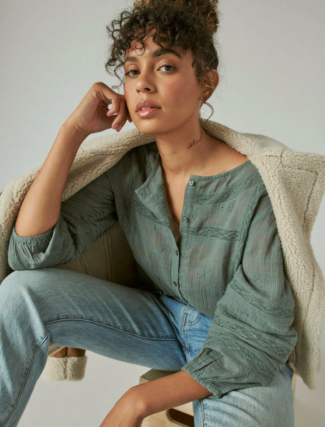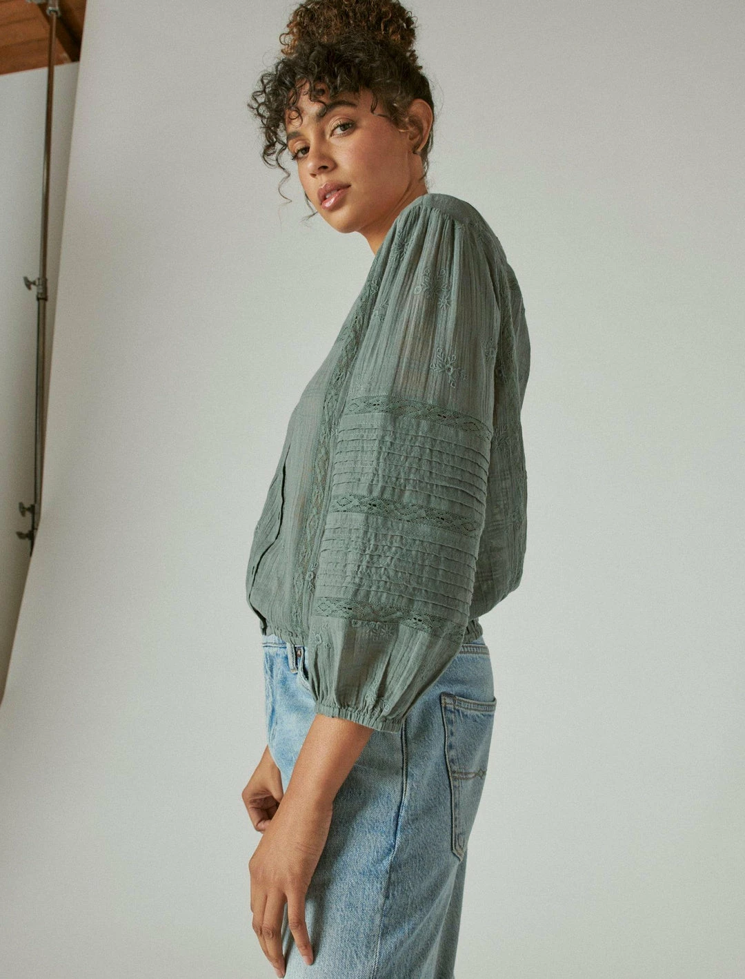 The textured fabrication and sweet lace detailing of this popover blouse make styling easy with your favorite Lucky jeans.Round neck with button-down closure. Long sleeves